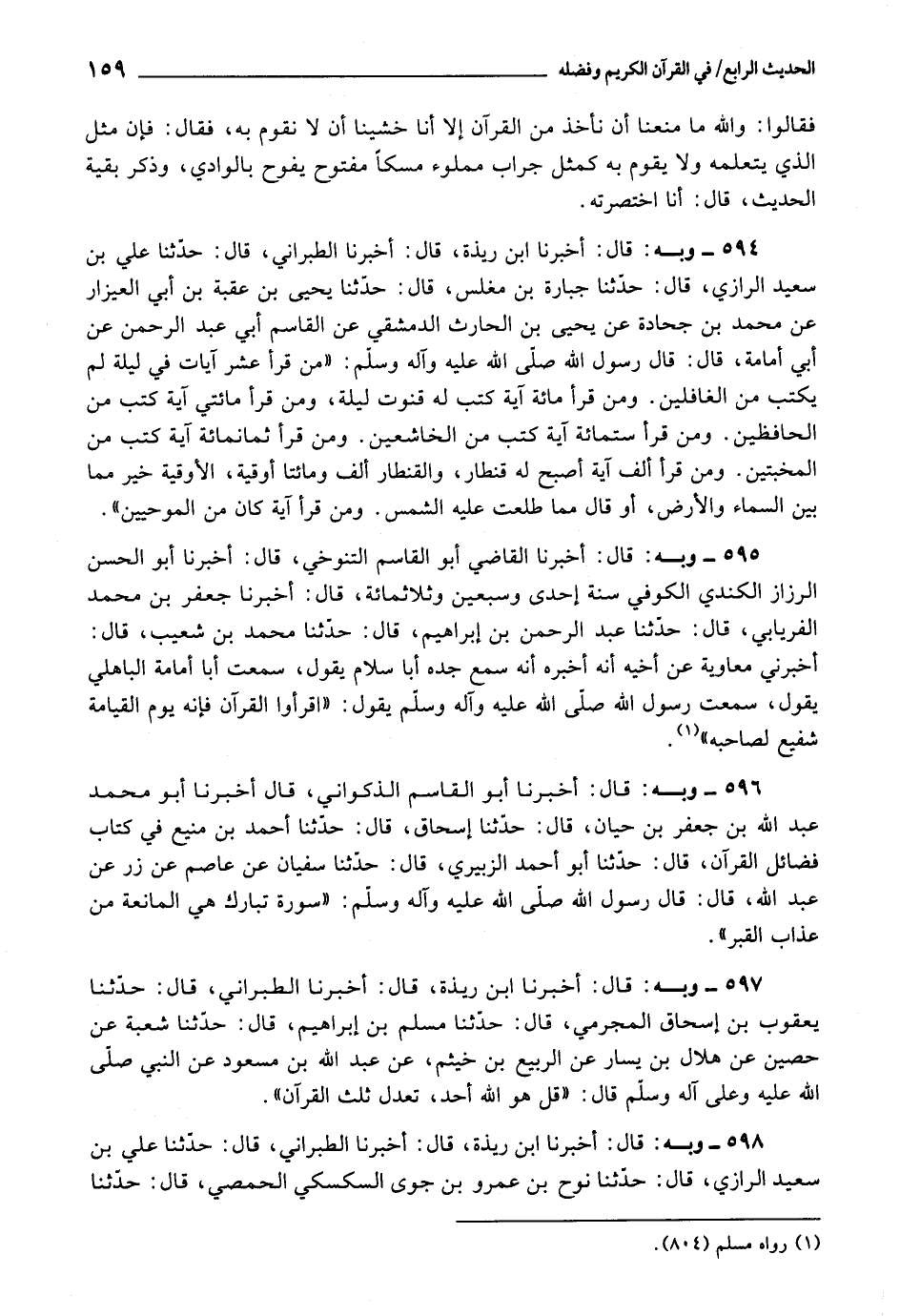 594 - أَخْبَرَنَا ابْنُ رَيْذَةَ، قَالَ: أَخْبَرَنَا الطَّبَرَانِيُّ، قَالَ: حَدَّثَنَا عَلِيُّ بْنُ سَعِيدٍ الرَّازِيُّ، قَالَ: حَدَّثَنَا جُبَارَةُ بْنُ مُغَلِّسٍ، قَالَ: حَدَّثَنَا يَحْيَى بْنُ عُقْبَةَ بْنِ أَبِي الْعَيْزَارِ، عَنْ مُحَمَّدِ بْنِ جُحَادَةَ، عَنْ يَحْيَى بْنِ الْحَارِثِ الدِّمَشْقِيِّ، عَنِ الْقَاسِمِ أَبِي عَبْدِ الرَّحْمَنِ، عَنْ أَبِي أُمَامَةَ، قَالَ: قَالَ رَسُولُ اللَّهِ صَلَّى اللَّهُ عَلَيْهِ وَآلِهِ وَسَلَّمَ: «مَنْ قَرَأَ عَشْرَ آيَاتٍ فِي لَيْلَةٍ لَمْ يُكْتَبْ مِنَ الْغَافِلِينَ، وَمَنْ قَرَأَ مِائَةَ آيَةٍ كُتِبَ لَهُ قُنُوتُ لَيْلَةٍ، وَمَنْ قَرَأَ مِائَتَيْ آيَةٍ كُتِبَ مَنِ الْحَافِظِينَ، وَمَنْ قَرَأَ سِتَّ مِائَةِ آيَةٍ كُتِبَ مِنَ الْخَاشِعِينَ، وَمَنَ قَرَأَ ثَمَانِ مِائَةِ آيَةٍ كُتِبَ مَنِ الْمُخْبِتِينَ، وَمَنْ قَرَأَ أَلْفَ آيَةٍ أَصْبَحَ لَهُ قِنْطَارٌ، وَالْقِنْطَارُ أَلْفٌ وَمِائَتَا أَوْقِيَةٍ، الْأَوْقِيَةُ خَيْرٌ مِمَّا بَيْنَ السَّمَاءِ وَالْأَرْضِ» ، أَوْ قَالَ: «مِمَّا طَلَعَتْ عَلَيْهِ الشَّمْسُ، وَمَنْ قَرَأَ آيَةً كَانَ مِنَ الْمُوحِيينَ»