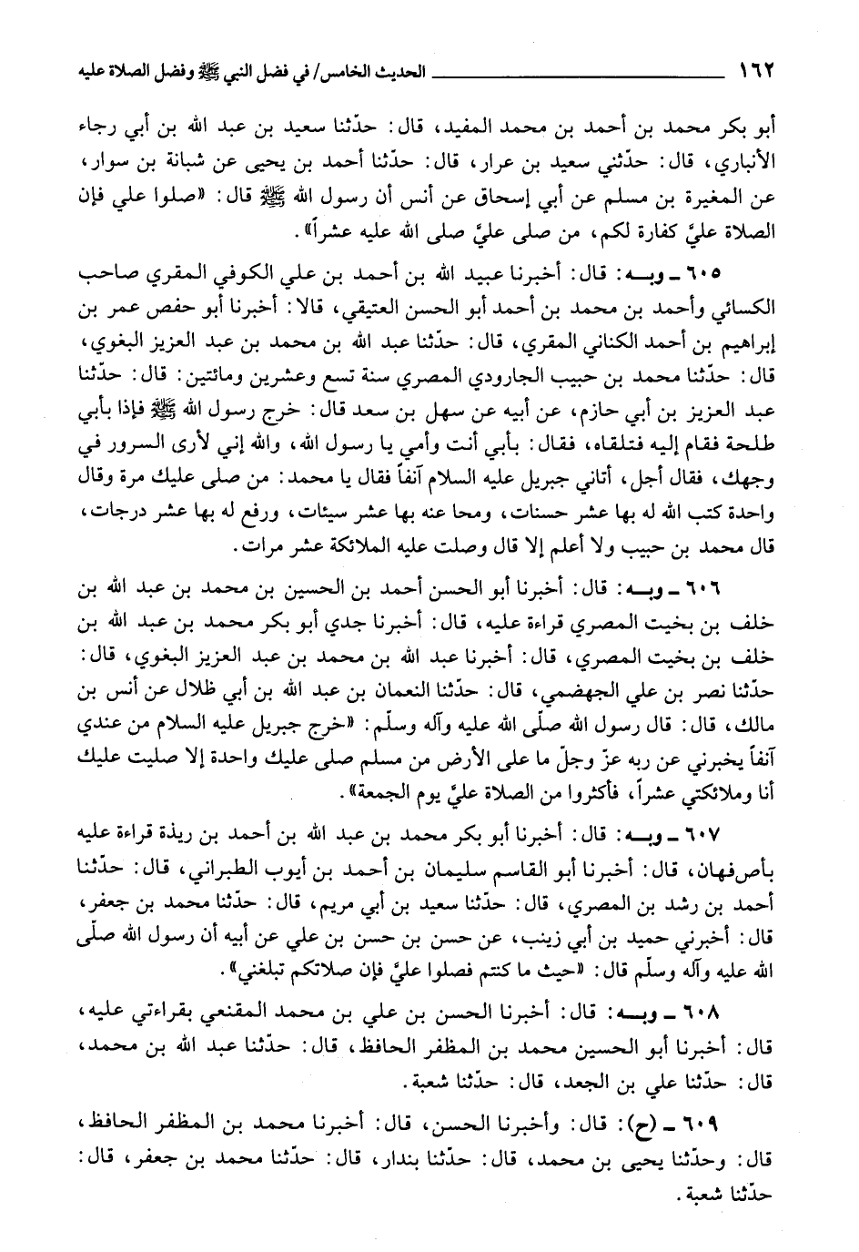 606 - أَخْبَرَنَا أَبُو الْحَسَنِ أَحْمَدُ بْنُ الْحُسَيْنِ بْنِ مُحَمَّدِ بْن عَبْدِ اللَّهِ بْنِ خَلَفِ بْنِ بَخِيتٍ الْمِصْرِيُّ، قِرَاءَةً عَلَيْهِ، قَالَ: أَخْبَرَنَا جَدِّي أَبُو بَكْرٍ مُحَمَّدُ بْن عَبْدِ اللَّهِ بْنِ خَلَفِ بْنِ بَخِيتٍ الْمِصْرِيُّ، قَالَ: أَخْبَرَنَا عَبْدُ اللَّهِ بْنُ مُحَمَّدِ بْنِ عَبْدِ الْعَزِيزِ الْبَغَوِيُّ، قَالَ: حَدَّثَنَا نَصْرُ بْنُ عَلِيٍّ الْجَهْضَمِيُّ، قَالَ: حَدَّثَنَا النُّعْمَانُ بْنُ عَبْدِ اللَّهِ بْنِ أَبِي ظِلَالٍ، عَنْ أَنَسِ بْنِ مَالِكٍ، قَالَ: قَالَ رَسُولُ اللَّهِ صَلَّى اللَّهُ عَلَيْهِ وَآلِهِ وَسَلَّمَ: «خَرَجَ جِبْرِيلُ عَلَيْهِ السَّلَامُ مِنْ عِنْدِي آنِفًا يُخْبِرُنِي عَنْ رَبُّهُ عَزَّ وَجَلَّ مَا عَلَى الْأَرْضِ مِنْ مُسْلِمٍ صَلَّى عَلَيْكَ وَاحِدَةً إِلَّا صَلَّيْتُ عَلَيْكَ أَنَا وَمَلَائِكَتِي عَشْرًا، فَأَكْثِرُوا مِنَ الصَّلَاةِ عَلِيَّ يَوْمَ الْجُمُعَةِ»