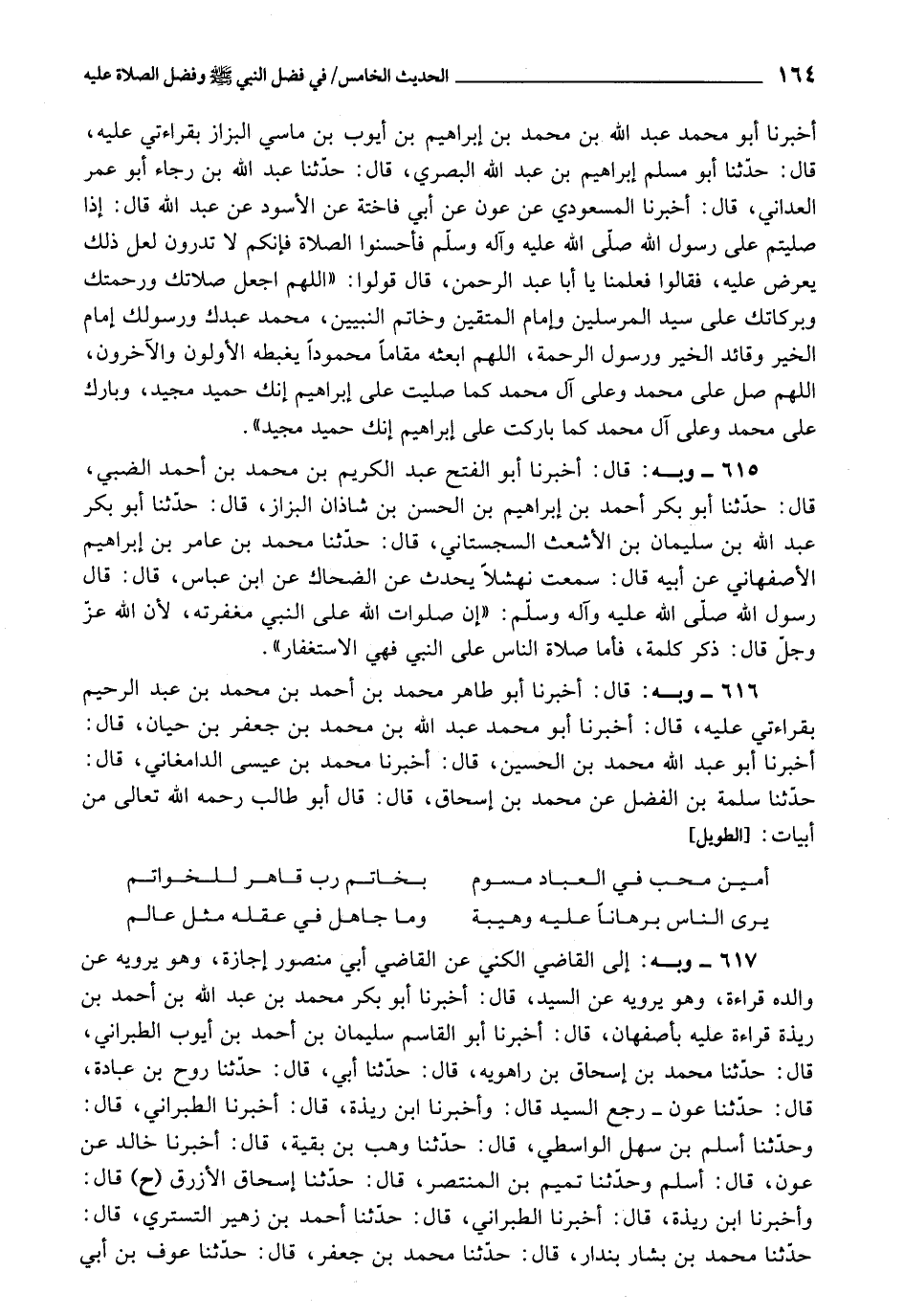 أَخْبَرَنَا أَبُو مُحَمَّدٍ عَبْدُ اللَّهِ بْنُ مُحَمَّدِ بْنِ إِبْرَاهِيمَ بْنِ أَيُّوبَ بْنِ مَاسِيٍّ الْبَزَّازُ، بِقِرَاءَتِي عَلَيْهِ، قَالَ: حَدَّثَنَا أَبُو مُسْلِمٍ إِبْرَاهِيمُ بْنُ عَبْدِ اللَّهِ الْبَصْرِيُّ، قَالَ: حَدَّثَنَا عَبْدُ اللَّهِ بْنُ رَجَاءٍ أَبُو عُمَرَ الْعَدَانِيُّ، قَالَ: أَخْبَرَنَا الْمَسْعُودِيُّ، عَنْ عَوْنٍ، عَنْ أَبِي فَاخِتَةَ، عَنِ الْأَسْوَدِ، عَنْ عَبْدِ اللَّهِ، قَالَ: إِذَا صَلَّيْتُمْ عَلَى رَسُولِ اللَّهِ صَلَّى اللَّهُ عَلَيْهِ وَآلِهِ وَسَلَّمَ فَأَحْسِنُوا الصَّلَاةَ فَإِنَّكُمْ لَا تَدْرُونَ لَعَلَّ ذَلِكَ يُعْرَضُ عَلَيْهِ، فَقَالُوا: فَعَلِّمْنَا يَا أَبَا عَبْدِ الرَّحْمَنِ، قَالَ: قُولُوا: «اللَّهُمَّ اجْعَلْ صَلَاتَكَ وَرَحْمَتَكَ وَبَرَكَاتِكَ عَلَى سَيِّدِ الْمُرْسَلِينَ وَإِمَامِ الْمُتَّقِينَ وَخَاتَمِ النَّبِيِّينَ، مُحَمَّدٍ عَبْدِكَ وَرَسُولِكَ إِمَامِ الْخَيْرِ وَقَائِدِ الْخَيْرِ وَرَسُولِ الرَّحْمَةِ، اللَّهُمَّ ابْعَثْهُ مَقَامًا مَحْمُودًا يَغْبِطُهُ الْأَوَّلُونَ وَالْآخِرُونَ، اللَّهُمَّ صَلِّ عَلَى مُحَمَّدٍ وَعَلَى آلِ مُحَمَّدٍ كَمَا صَلَّيْتَ عَلَى إِبْرَاهِيمَ إِنَّكَ حَمِيدٌ مَجِيدٌ، وَبَارِكْ عَلَى مُحَمَّدٍ وَعَلَى آلِ مُحَمَّدٍ كَمَا بَارَكْتَ عَلَى إِبْرَاهِيمَ إِنَّكَ حَمِيدٌ مَجِيدٌ»