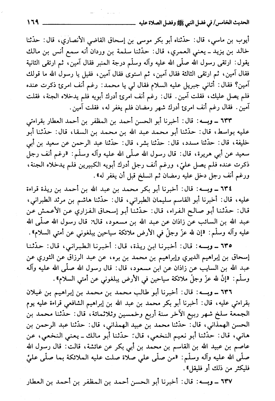 634 - أَخْبَرَنَا أَبُو بَكْرٍ مُحَمَّدُ بْنُ عَبْدِ اللَّهِ بْنِ أَحْمَدَ بْنَ رَيْذَةَ، قِرَاءَةً عَلَيْهِ، قَالَ: أَخْبَرَنَا أَبُو الْقَاسِمِ سُلَيْمَانُ الطَّبَرَانِيُّ، قَالَ: حَدَّثَنَا هَاشِمُ بْنُ مَرْثَدٍ الطَّبَرَانِيُّ، قَالَ: حَدَّثَنَا أَبُو صَالِحٍ الْفَرَّاءُ، قَالَ: حَدَّثَنَا أَبُو إِسْحَاقَ الْفَزَارِيُّ، عَنِ الْأَعْمَشِ، عَنْ عَبْدِ اللَّهِ بْنِ السَّائِبِ، عَنْ زَاذَانَ، عَنْ عَبْدِ اللَّهِ بْنِ مَسْعُودٍ، قَالَ: قَالَ رَسُولُ اللَّهِ صَلَّى اللَّهُ عَلَيْهِ وَآلِهِ وَسَلَّمَ: «إِنَّ لِلَّهِ عَزَّ وَجَلَّ فِي الْأَرْضِ مَلَائِكَةً سَيَّاحِينَ يُبَلِّغُونِي عَنْ أُمَّتِي السَّلَامَ»