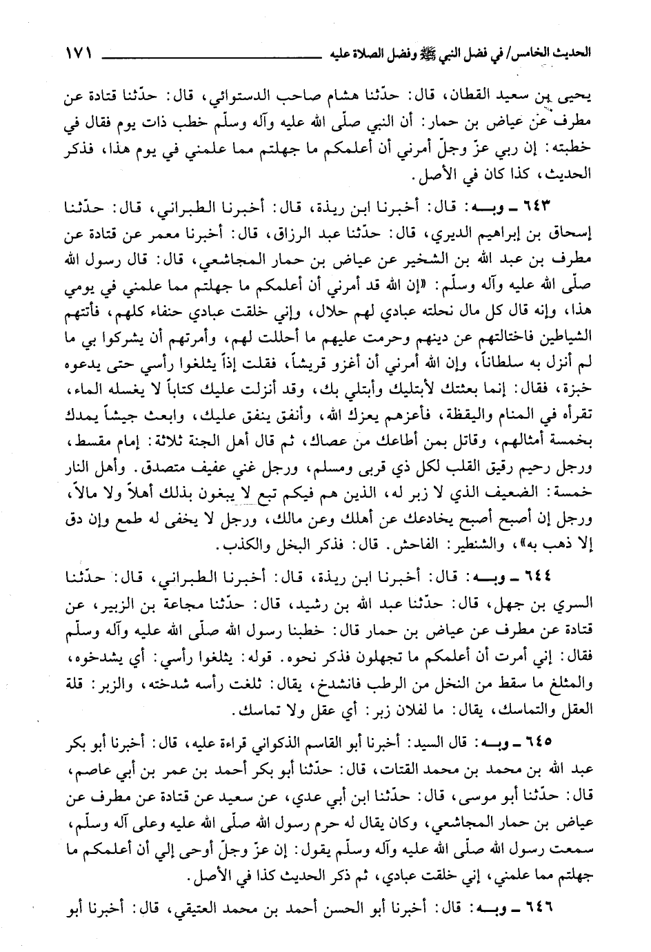 643 - أَخْبَرَنَا ابْنُ رَيْذَةَ، قَالَ: أَخْبَرَنَا الطَّبَرَانِيُّ، قَالَ: حَدَّثَنَا إِسْحَاقُ بْنُ إِبْرَاهِيمَ الدِّيرِيُّ، قَالَ: حَدَّثَنَا عَبْدُ الرَّزَّاقِ، قَالَ: أَخْبَرَنَا مَعْمَرٌ، عَنْ قَتَادَةَ، عَنْ مُطَرِّفِ بْنِ عَبْدِ اللَّهِ بْنِ الشِّخِّيرِ، عَنْ عِيَاضِ بْنِ حِمَارٍ الْمُجَاشِعِيِّ، قَالَ: قَالَ رَسُولُ اللَّهِ صَلَّى اللَّهُ عَلَيْهِ وَآلِهِ وَسَلَّمَ: «إِنَّ اللَّهَ قَدْ أَمَرَنِي أَنْ أُعَلِّمَكُمْ مَا جَهِلْتُمْ مِمَّا عَلَّمَنِي فِي يَوْمِي هَذَا» ، وَإِنَّهُ قَالَ: " كُلُّ مَالٍ نَحَلْتُهُ عِبَادِي لَهُمْ حَلَالٌ، وَإِنِّي خَلَقْتُ عِبَادِي حُنَفَاءَ كُلَّهُمْ، فَأَتَتْهُمُ الشَّيَاطِينُ فَاخْتَالَتْهُمْ عَنْ دِينِهِمْ، وَحَرَّمَتْ عَلَيْهِمْ مَا أَحْلَلْتُ لَهُمْ، وَأَمَرَتْهُمْ أَنْ يُشْرِكُوا بِي مَا لَمْ أُنَزِّلْ بِهِ سُلْطَانًا، وَإِنَّ اللَّهَ أَمَرَنِي أَنْ أَغْزُوَ قُرَيْشًا، فَقُلْتُ: إِذًا يَثْلَغُوا رَأْسِي حَتَّى يَدَعُوهُ خُبْزَةً، فَقَالَ: إِنَّمَا بَعَثْتُكَ لِأَبْتَلِيَكَ وَأَبْتَلِيَ بِكَ، وَقَدْ أَنْزَلْتُ عَلَيْكَ كِتَابًا لَا يَغْسِلُهُ الْمَاءُ، تَقْرَؤُهُ فِي الْمَنَامِ وَالْيَقَظَةِ، فَاغْزُهُمْ يُعِزُّكَ اللَّهُ، وَأَنْفِقْ يُنْفَقْ عَلَيْكَ، وَابْعَثْ جَيْشًا يَمُدُّكَ بِخَمْسَةِ أَمْثَالِهِمْ، وَقَاتِلْ بِمَنْ أَطَاعَكَ مَنْ عَصَاكَ "، ثُمَّ قَالَ: " أَهْلُ الْجَنَّةِ ثَلَاثَةٌ: إِمَامٌ مُقْسِطٌ، وَرَجُلٌ رَحِيمٌ رَقِيقُ الْقَلْبِ لِكُلِّ ذِي قُرْبَى وَمُسْلِمٍ، وَرَجُلٌ غَنِيٌّ عَفِيفٌ مُتَصَدِّقٌ.