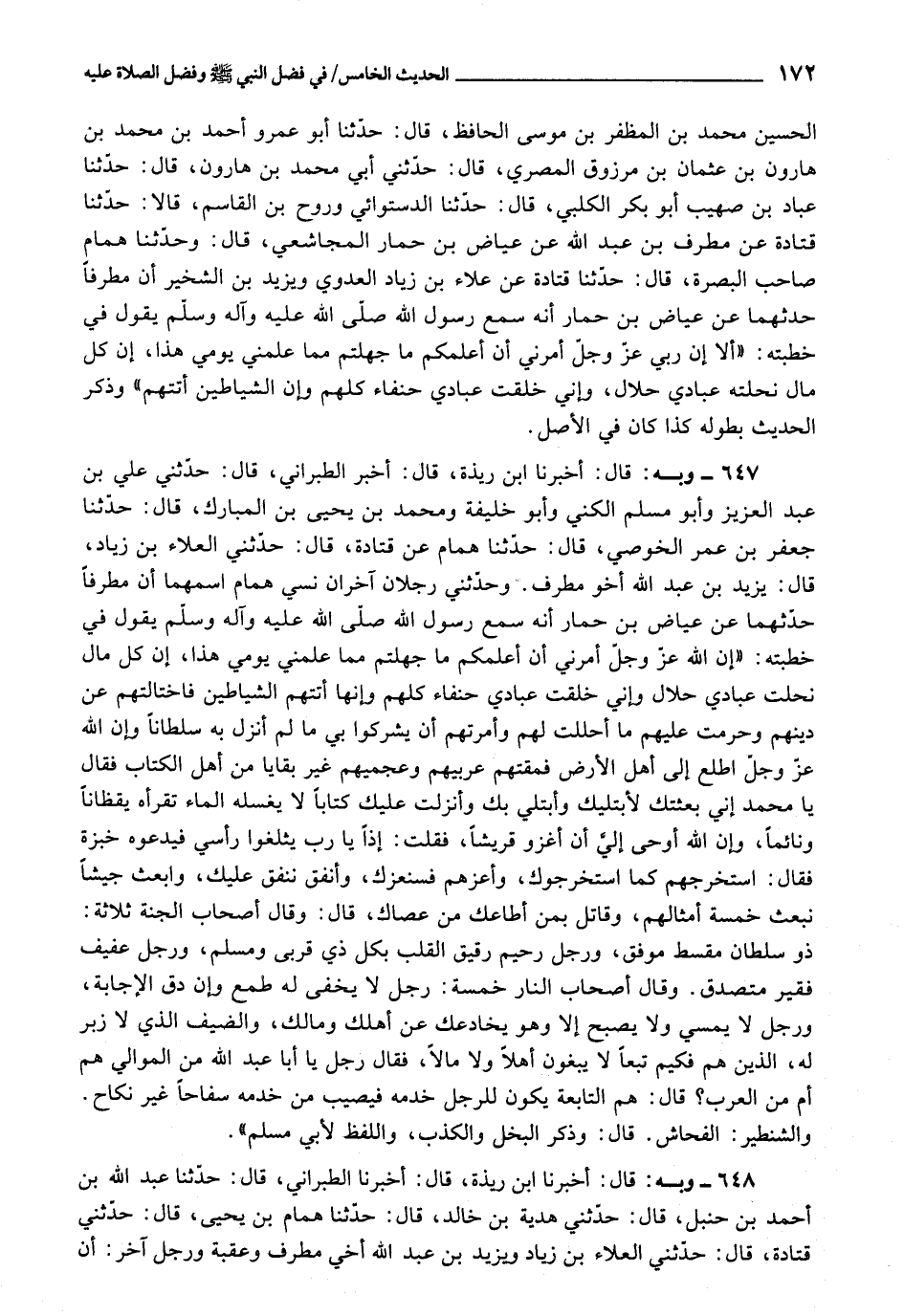 الْحُسَيْنِ مُحَمَّدُ بْنُ الْمُظَفَّرِ بْنِ مُوسَى الْحَافِظُ، قَالَ: حَدَّثَنَا أَبُو عَمْرٍو أَحْمَدُ بْنُ مُحَمَّدِ بْنِ هَارُونَ بْنِ عُثْمَانَ بْنِ مَرْزُوقٍ الْمِصْرِيُّ، قَالَ: حَدَّثَنِي أَبِي مُحَمَّدُ بْنُ هَارُونَ، قَالَ: حَدَّثَنَا عَبَّادُ بْنُ صُهَيْبٍ أَبُو بَكْرٍ الْكَلْبِيُّ، قَالَ: وَرَوْحُ بْنُ الْقَاسِمِ، حَدَّثَنَا الدَّسْتُوَائِيُّ، قَالَا: حَدَّثَنَا قَتَادَةُ، عَنْ مُطَرِّفِ بْنِ عَبْدِ اللَّهِ، عَنْ عِيَاضِ بْنِ حِمَارٍ الْمُجَاشِعِيِّ، قَالَ: وَحَدَّثَنَا هَمَّامٌ صَاحِبُ الْبَصْرَةِ، قَالَ: حَدَّثَنَا قَتَادَةُ، عَنْ عَلَاءِ بْنِ زِيَادٍ الْعَدَوِيِّ، وَيَزِيدُ بْنُ الشِّخِّيرِ، أَنَّ مُطَرِّفًا حَدَّثَهُمَا، عَنْ عِيَاضِ بْنِ حِمَارٍ، أَنَّهُ سَمِعَ رَسُولَ اللَّهِ صَلَّى اللَّهُ عَلَيْهِ وَآلِهِ وَسَلَّمَ، يَقُولُ فِي خُطْبَتِهِ: «أَلَا إِنَّ رَبِّي عَزَّ وَجَلَّ أَمَرَنِي أَنْ أُعَلِّمَكُمْ مَا جَهِلْتُمْ مِمَّا عَلَّمَنِي فِي يَوْمِي هَذَا، إِنَّ كُلَّ مَالٍ نَحَلْتُهُ عِبَادِي حَلَالٌ، وَإِنِّي خَلَقْتُ عِبَادِي حُنَفَاءَ كُلَّهُمْ، وَإِنَّ الشَّيَاطِينَ أَتَتْهُمْ» .
