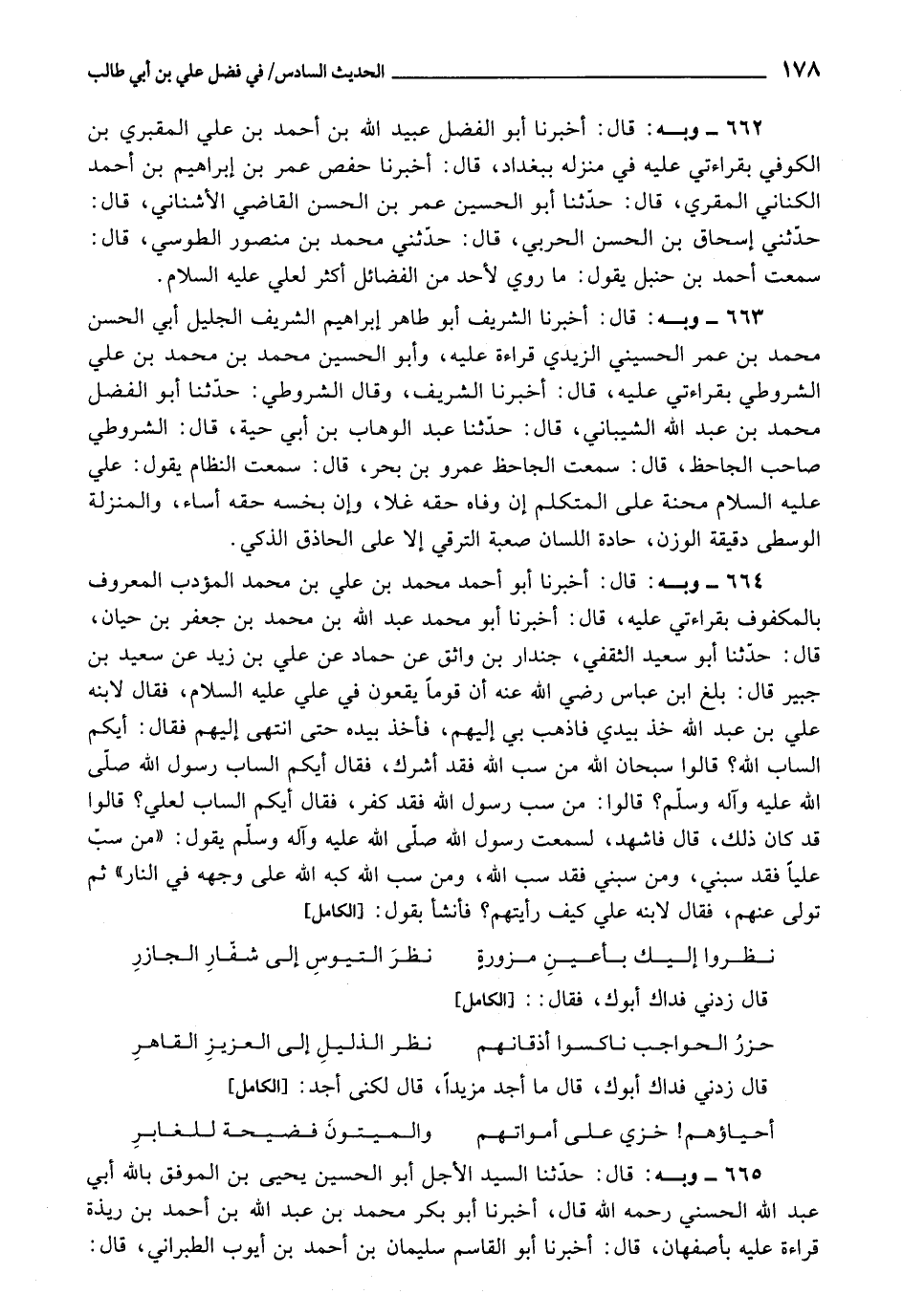 664 - أَخْبَرَنَا أَبُو أَحْمَدَ مُحَمَّدُ بْنُ عَلِيِّ بْنِ مُحَمَّدٍ الْمُؤَدِّبُ الْمَعْرُوفُ بِالْمَكْفُوفِ، بِقِرَاءَتِي عَلَيْهِ، قَالَ: أَبُو مُحَمَّدٍ عَبْدُ اللَّهِ بْنُ مُحَمَّدِ بْنِ جَعْفَرِ بْنِ حَيَّانَ، قَالَ: حَدَّثَنَا أَبُو سَعِيدٍ الثَّقَفِيُّ جُنْدَارُ بْنُ وَاثِقٍ، عَنْ حَمَّادٍ، عَنْ عَلِيِّ بْنِ زَيْدٍ، عَنْ سَعِيدِ بْنِ جُبَيْرٍ، قَالَ: بَلَغَ ابْنَ عَبَّاسٍ رَضِيَ اللَّهُ عَنْهُ، أَنَّ قَوْمًا يَقَعُونَ فِي عَلِيٍّ عَلَيْهِ السَّلَامُ، فَقَالَ لِابْنِهِ عَلِيِّ بْنِ عَبْدِ اللَّهِ: خُذْ بِيَدِي فَاذْهَبْ بِي إِلَيْهِمْ، فَأَخَذَ بِيَدِهِ حَتَّى انْتَهَى إِلَيْهِمْ فَقَالَ: أَيُّكُمُ السَّابُّ اللَّهَ؟ قَالُوا: سُبْحَانَ اللَّهِ مَنْ سَبَّ اللَّهَ فَقَدْ أَشْرَكَ، فَقَالَ: أَيُّكُمُ السَّابُّ رَسُولَ اللَّهِ صَلَّى اللَّهُ عَلَيْهِ وَآلِهِ وَسَلَّمَ؟ قَالُوا: مَنْ سَبَّ رَسُولَ اللَّهِ صَلَّى اللَّهُ عَلَيْهِ وَآلِهِ وَسَلَّمَ فَقَدْ كَفَرَ، فَقَالَ: أَيُّكُمُ السَّابُّ لِعَلِيٍّ؟ قَالُوا: قَدْ كَانَ ذَلِكَ، قَالَ فَأَشْهَدُ لَسَمِعْتُ رَسُولَ اللَّهِ صَلَّى اللَّهُ عَلَيْهِ وَآلِهِ وَسَلَّمَ، يَقُولُ: «مَنْ سَبَّ عَلِيًّا فَقَدْ سَبَّنِي، وَمَنْ سَبَّنِي فَقَدْ سَبَّ اللَّهَ، وَمَنْ سَبَّ اللَّهَ كَبَّهُ اللَّهُ عَلَى وَجْهِهِ فِي النَّارِ» .