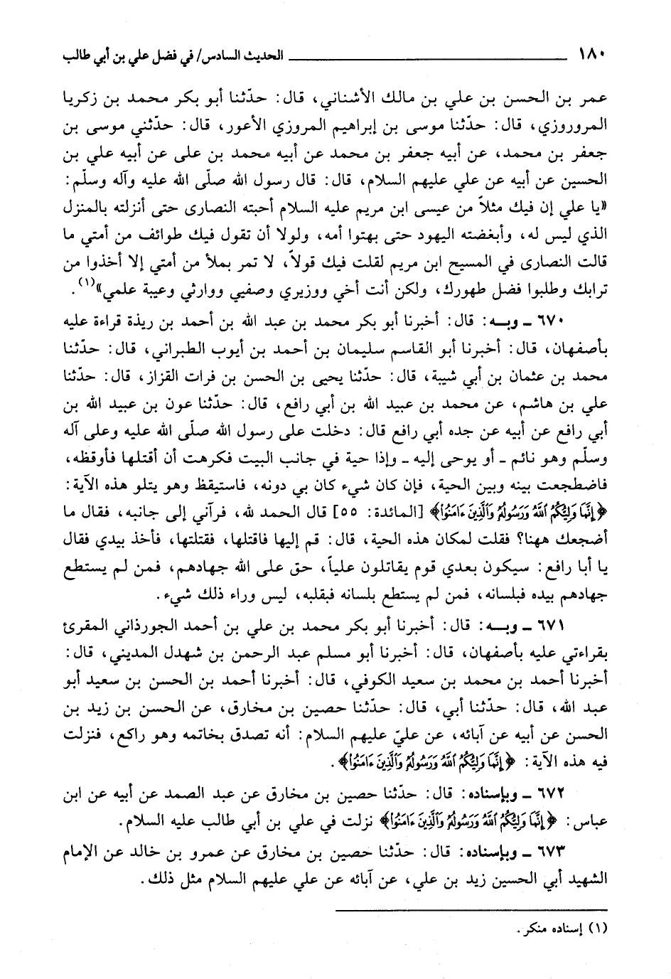 671 - أَخْبَرَنَا أَبُو بَكْرٍ مُحَمَّدُ بْنُ عَلِيِّ بْنِ أَحْمَدَ الْجُوزَدَانِيُّ الْمُقْرِيُّ، بِقِرَاءَتِي عَلَيْهِ بِأَصْفَهَانَ، قَالَ: أَخْبَرَنَا أَبُو مُسْلِمٍ عَبْدُ الرَّحْمَنِ بْنُ شَهْدَلٍ الْمَدِينِيُّ، قَالَ: أَخْبَرَنَا أَحْمَدُ بْنُ مُحَمَّدِ بْنِ سَعِيدٍ الْكُوفِيُّ، قَالَ: أَخْبَرَنَا أَحْمَدُ بْنُ الْحَسَنِ بْنِ سَعِيدٍ أَبُو عَبْدِ اللَّهِ، قَالَ: حَدَّثَنَا أَبِي، قَالَ: حَدَّثَنَا حُصَيْنُ بْنُ مُخَارِقٍ، عَنِ الْحَسَنِ بْنِ زَيْدِ بْنِ الْحَسَنِ، عَنْ أَبِيهِ، عَنْ آبَائِهِ، عَنْ عَلِيٍّ عَلَيْهِمُ السَّلَامُ " أَنَّهُ تَصَدَّقَ بِخَاتَمِهِ وَهُوَ رَاكِعٌ، فَنَزَلَتْ فِيهِ هَذِهِ الْآيَةُ {إِنَّمَا وَلِيُّكُمُ اللَّهُ وَرَسُولُهُ وَالَّذِينَ آمَنُوا} [المائدة: 55] "
