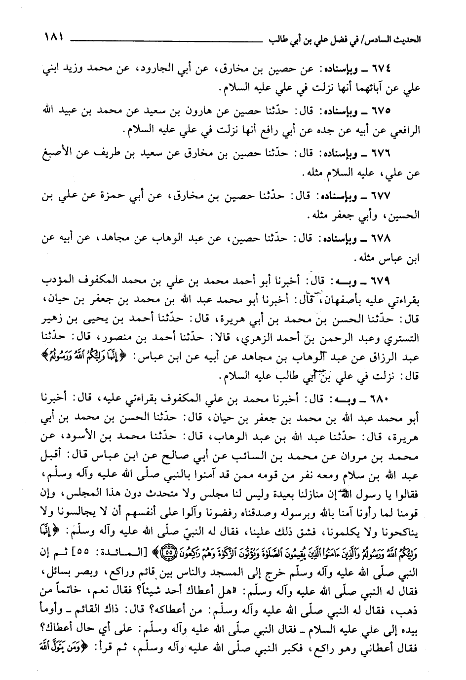 675 - وَبِإِسْنَادِهِ، قَالَ: حَدَّثَنَا حُصَيْنٌ، عَنْ هَارُونَ بْنِ سَعِيدٍ، عَنْ مُحَمَّدِ بْنِ عُبَيْدِ اللَّهِ الرَّافِعِيِّ، عَنْ أَبِيهِ، عَنْ جَدِّهِ، عَنْ أَبِي رَافِعٍ: أَنَّهَا نَزَلَتْ فِي عَلِيٍّ عَلَيْهِ السَّلَامُ.