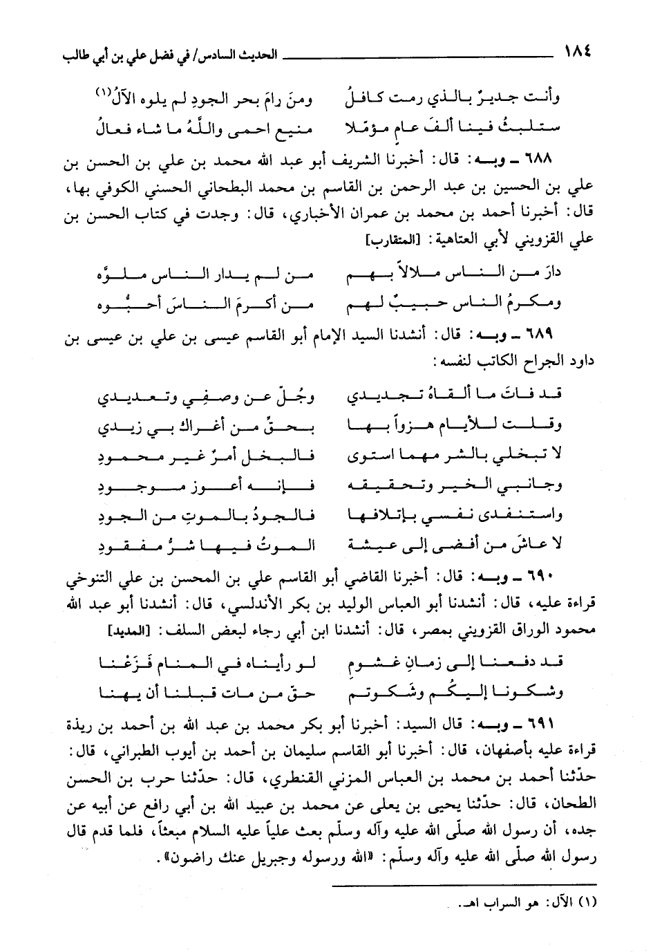 688 - أَخْبَرَنَا الشَّرِيفُ أَبُو عَبْدِ اللَّهِ مُحَمَّدُ بْنُ عَلِيِّ بْنِ الْحَسَنِ بْنِ عَلِيِّ بْنِ الْحُسَيْنِ بْنِ عَبْدِ الرَّحْمَنِ بْنِ الْقَاسِمِ بْنِ مُحَمَّدٍ الْبَطْحَانِيُّ الْحَسَنِيُّ الْكُوفِيُّ، بِهِا، قَالَ: أَخْبَرَنَا أَحْمَدُ بْنُ مُحَمَّدِ بْنِ عِمْرَانَ الْإِخْبَارِيُّ، قَالَ: وَجَدْتُ فِي كِتَابِ الْحَسَنِ بْنِ عَلِيٍّ الْقَزْوِينِيِّ لِأَبِي الْعَتَاهِيَةِ: