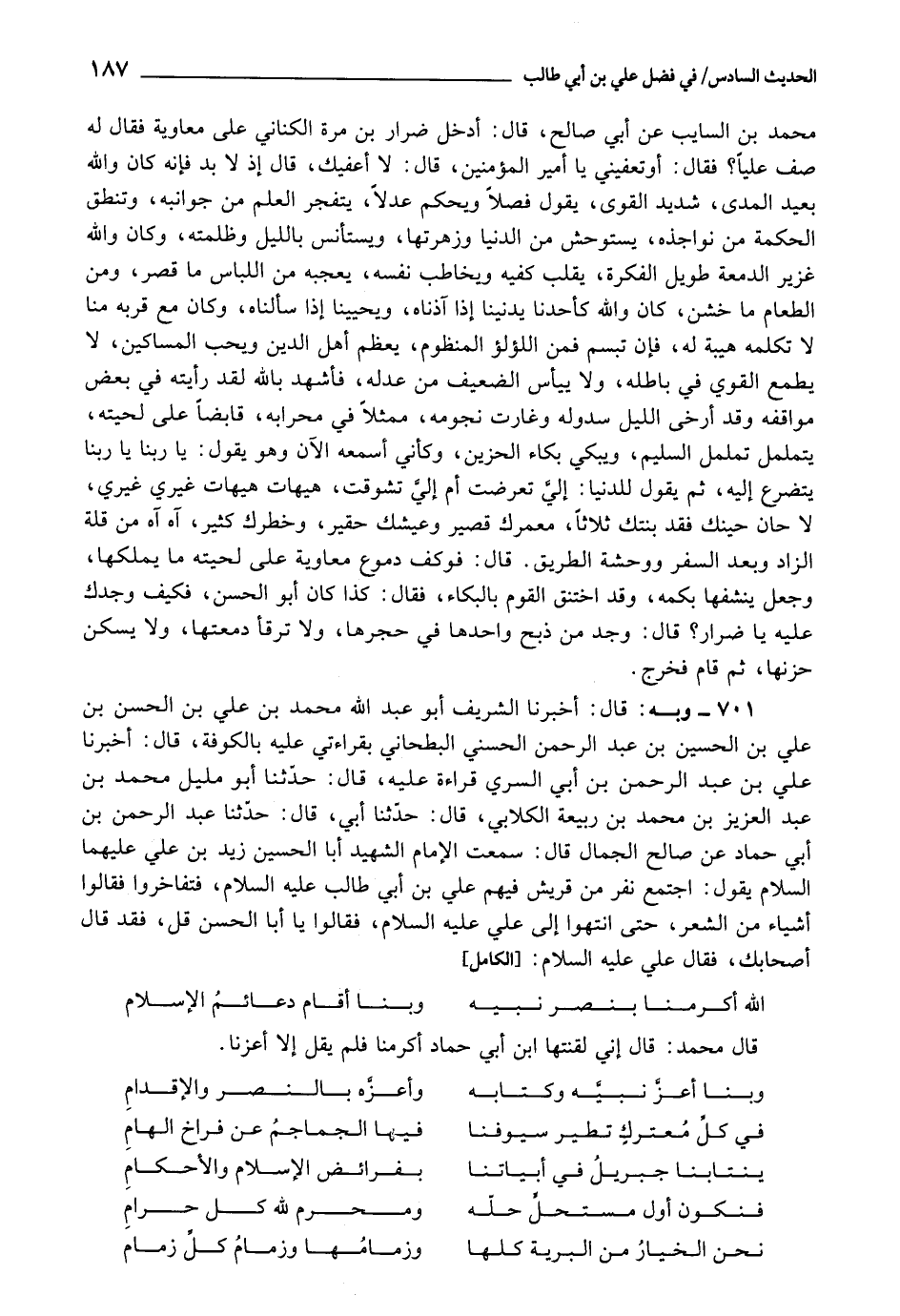 701 - أَخْبَرَنَا الشَّرِيفُ أَبُو عَبْدِ اللَّهِ مُحَمَّدُ بْنُ عَلِيِّ بْنِ الْحَسَنِ بْنِ عَلِيِّ بْنِ الْحُسَيْنِ بْنِ عَبْدِ الرَّحْمَنِ الْحَسَنِيُّ الْبَطْحَانِيُّ، بِقِرَاءَتِي عَلَيْهِ بِالْكُوفَةِ، قَالَ: أَخْبَرَنَا عَلِيُّ بْنُ عَبْدِ الرَّحْمَنِ بْنِ أَبِي السَّرِيِّ، قِرَاءَةً عَلَيْهِ، قَالَ: حَدَّثَنَا أَبُو مَلِيلٍ مُحَمَّدُ بْنُ عَبْدِ الْعَزِيزِ بْنِ مُحَمَّدِ بْنِ رَبِيعَةَ الْكِلَابِيُّ، قَالَ: حَدَّثَنَا أَبِي، قَالَ: حَدَّثَنَا عَبْدُ الرَّحْمَنِ بْنُ أَبِي حَمَّادٍ، عَنْ صَالِحٍ الْجَمَّالِ، قَالَ: سَمِعْتُ الْإِمَامَ الشَّهِيدَ أَبَا الْحُسَيْنِ زَيْدَ بْنَ عَلِيٍّ عَلَيْهِمَا السَّلَامُ، يَقُولُ: " اجْتَمَعَ نَفَرٌ مِنْ قُرَيْشٍ فِيهِمْ عَلِيُّ بْنُ أَبِي طَالِبٍ عَلَيْهِ السَّلَامُ، فَتَفَاخَرُوا فَقَالُوا أَشْيَاءَ مِنَ الشِّعْرِ، حَتَّى انْتَهَوْا إِلَي عَلِيٍّ عَلَيْهِ السَّلَامُ، فَقَالُوا: يَا أَبَا الْحَسَنِ قُلْ، فَقَدْ قَالَ أَصْحَابُكَ، فَقَالَ عَلِيٌّ عَلَيْهِ السَّلَامُ: اللَّهُ أَكْرَمَنَا بِنَصْرِ نَبِيِّهِ وَبِنَا أَقَامَ دَعَائِمَ الْإِسْلَامِ قَالَ مُحَمَّدٌ: قَالَ إِنِّي لَقَّنْتُهَا إِبْرَاهِيمَ بْنَ أَبِي حَمَّادٍ أَكْرَمَنَا فَلَمْ يَقُلْ إِلَّا أَعَزَّنَا: