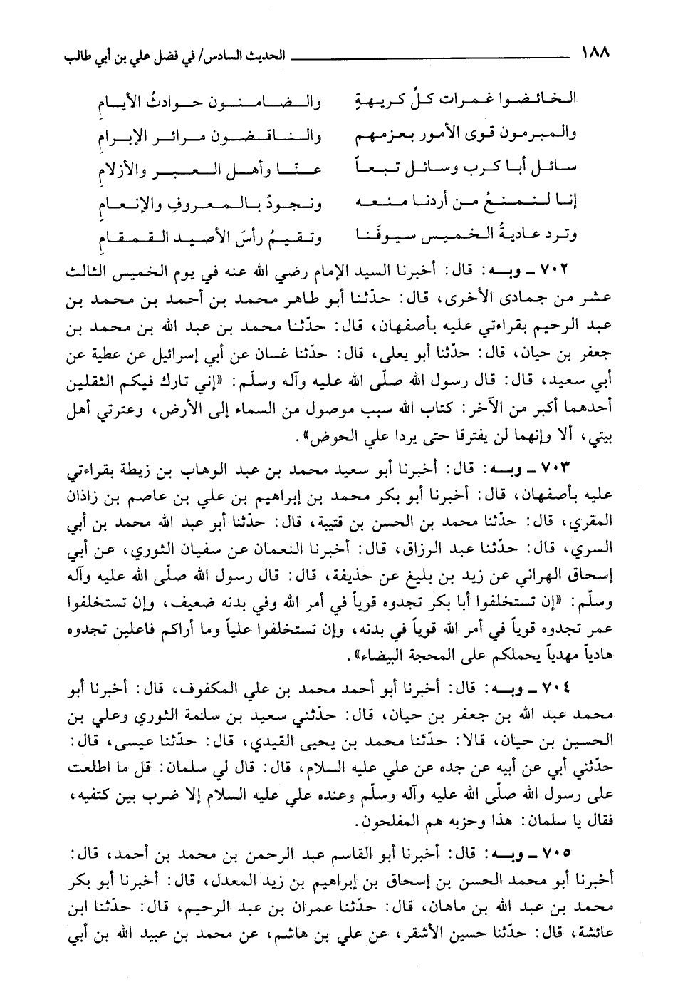 702 - حَدَّثَنَا أَبُو طَاهِرٍ مُحَمَّدُ بْنُ أَحْمَدَ بْنِ مُحَمَّدِ بْنِ عَبْدِ الرَّحْمَنِ، بِقِرَاءَتِي عَلَيْهِ بِأَصْفَهَانَ، قَالَ: حَدَّثَنَا أَبُو مُحَمَّدٍ عَبْدُ اللَّهِ بْنُ جَعْفَرِ بْنِ حَيَّانَ، قَالَ: حَدَّثَنَا أَبُو يَعْلَى، قَالَ: حَدَّثَنَا غَسَّانُ، عَنْ أَبِي إِسْرَائِيلَ، عَنْ عَطِيَّةَ، عَنْ أَبِي سَعِيدٍ، قَالَ: قَالَ رَسُولُ اللَّهِ صَلَّى اللَّهُ عَلَيْهِ وَآلِهِ وَسَلَّمَ: " إِنِّي تَارِكٌ فِيكُمُ الثَّقَلَيْنِ أَحَدُهُمَا أَكْبَرُ مِنَ الْآخَرِ: كِتَابُ اللَّهِ سَبَبٌ مَوْصُولٌ مِنَ السَّمَاءِ إِلَى الْأَرْضِ، وَعِتْرَتِي أَهْلُ بَيْتِي، أَلَا وَإِنَّهُمَا لَنْ يَفْتَرِقَا حَتَّى يَرِدَا عَلَى الْحَوْضِ "
