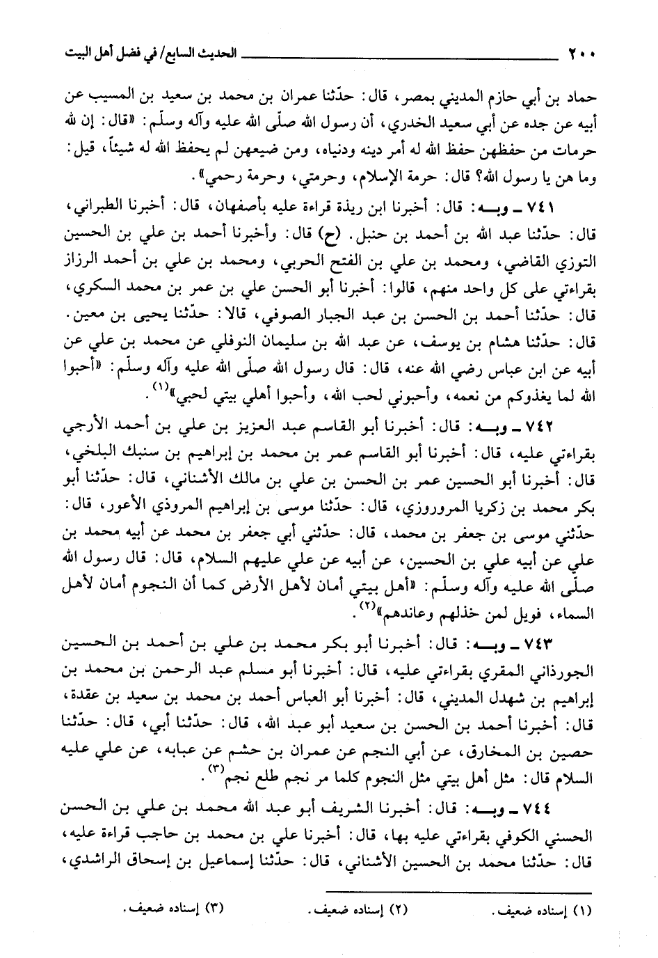 743 - أَخْبَرَنَا أَبُو بَكْرٍ مُحَمَّدُ بْنُ عَلِيِّ بْنِ مُحَمَّدِ بْنِ الْحُسَيْنِ الْجُوزَدَانِيُّ الْمُقْرِيُّ، بِقِرَاءَتِي عَلَيْهِ، قَالَ: أَخْبَرَنَا أَبُو مُسْلِمٍ عَبْدُ الرَّحْمَنِ بْنُ مُحَمَّدِ بْنِ إِبْرَاهِيمَ بْنِ شَهْدَلٍ الْمَدِينِيُّ، قَالَ: أَخْبَرَنَا أَبُو الْعَبَّاسِ أَحْمَدُ بْنُ مُحَمَّدِ بْنِ سَعِيدِ بْنِ عُقْدَةَ، قَالَ: أَخْبَرَنَا أَحْمَدُ بْنُ الْحَسَنِ بْنِ سَعِيدٍ أَبُو عَبْدِ اللَّهِ، قَالَ: حَدَّثَنَا أَبِي، قَالَ: حَدَّثَنَا حُصَيْنُ بْنُ الْمُخَارِقِ، عَنْ أَبِي النَّجْمِ، عَنْ عِمْرَانَ بْنِ حَشَمٍ، عَنْ عُبَابَهْ، عَنْ عَلِيٍّ عَلَيْهِ السَّلَامُ، قَالَ: «مَثَلُ أَهْلِ بَيْتِي مَثَلُ النُّجُومِ كُلَّمَا مَرَّ نَجْمٌ طَلَعَ نَجْمٌ»