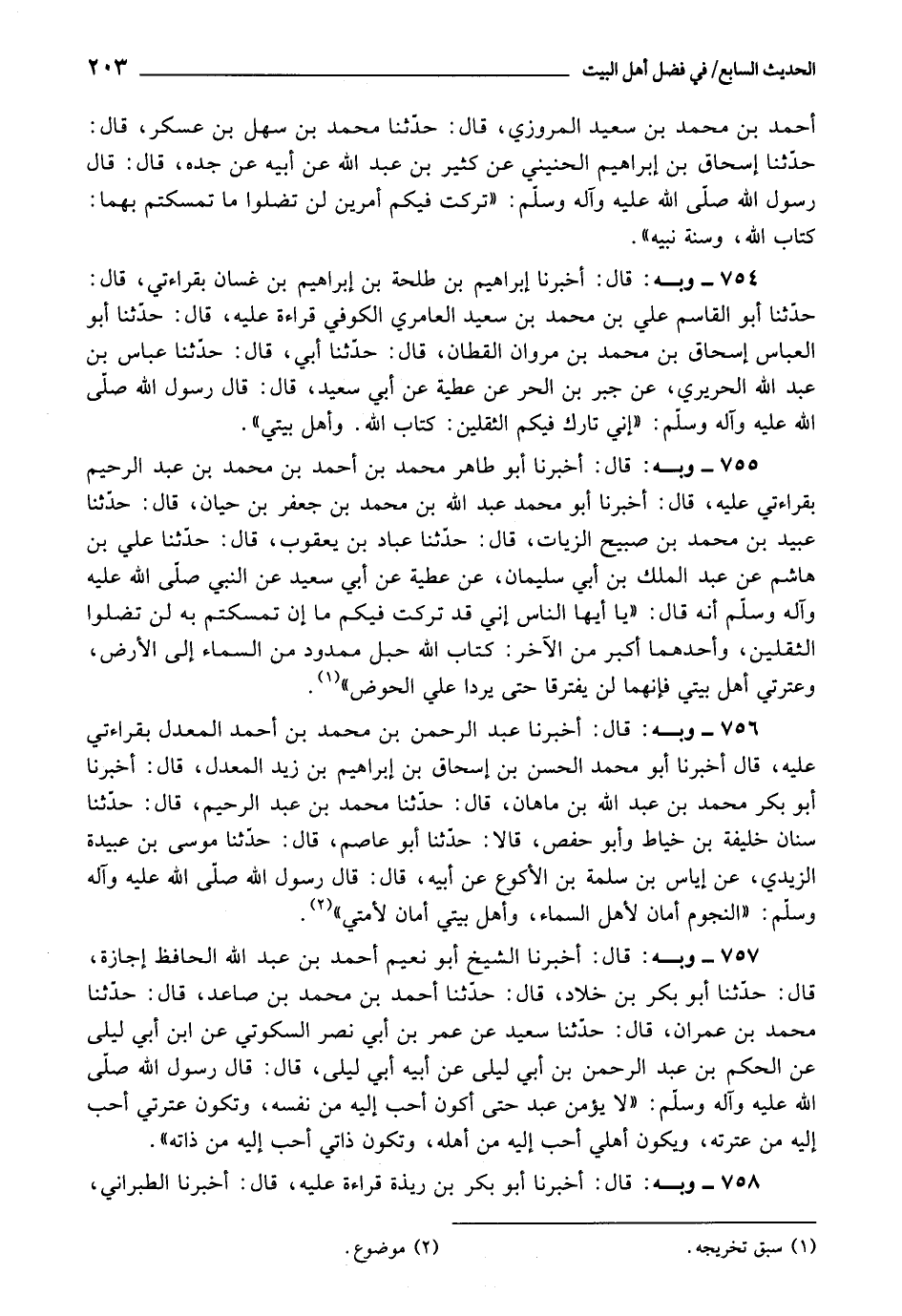 755 - أَخْبَرَنَا أَبُو طَاهِرٍ بْنُ أَحْمَدَ بْنِ مُحَمَّدِ بْنِ عَبْدِ الرَّحِيمِ، بِقِرَاءَتِي عَلَيْهِ، قَالَ: أَبُو مُحَمَّدٍ عَبْدُ اللَّهِ بْنُ جَعْفَرِ بْنِ حَيَّانَ، قَالَ: حَدَّثَنَا عُبَيْدُ بْنُ مُحَمَّدِ بْنِ صُبَيْحٍ الزَّيَّاتُ، قَالَ: حَدَّثَنَا عَبَّادُ بْنُ يَعْقُوبَ، قَالَ: حَدَّثَنَا عَلِيُّ بْنُ هَاشِمِ، عَنْ عَبْدِ الْمَلِكِ بْنِ أَبِي سُلَيْمَانَ، عَنْ عَطِيَّةَ، عَنْ أَبِي سَعِيدٍ، عَنِ النَّبِيِّ صَلَّى اللَّهُ عَلَيْهِ وَآلِهِ وَسَلَّمَ، أَنَّهُ قَالَ: " يَأَيُّهَا النَّاسُ، إِنِّي قَدْ تَرَكْتُ فِيكُمْ مَا إِنْ تَمَسَّكْتُمْ بِهِ لَنْ تَضِلُّوا الثَّقَلَيْنِ، وَأَحَدُهُمَا أَكْبَرُ مِنَ الْآخَرِ: كِتَابُ اللَّهِ حَبْلٌ مَمْدُودٌ مِنَ السَّمَاءِ إِلَى الْأَرْضِ، وَعِتْرَتِي أَهْلُ بَيْتِي فَإِنَّهُمَا لَنْ يَفْتَرِقَا حَتَّى يَرِدَا عَلَى الْحَوْضِ "