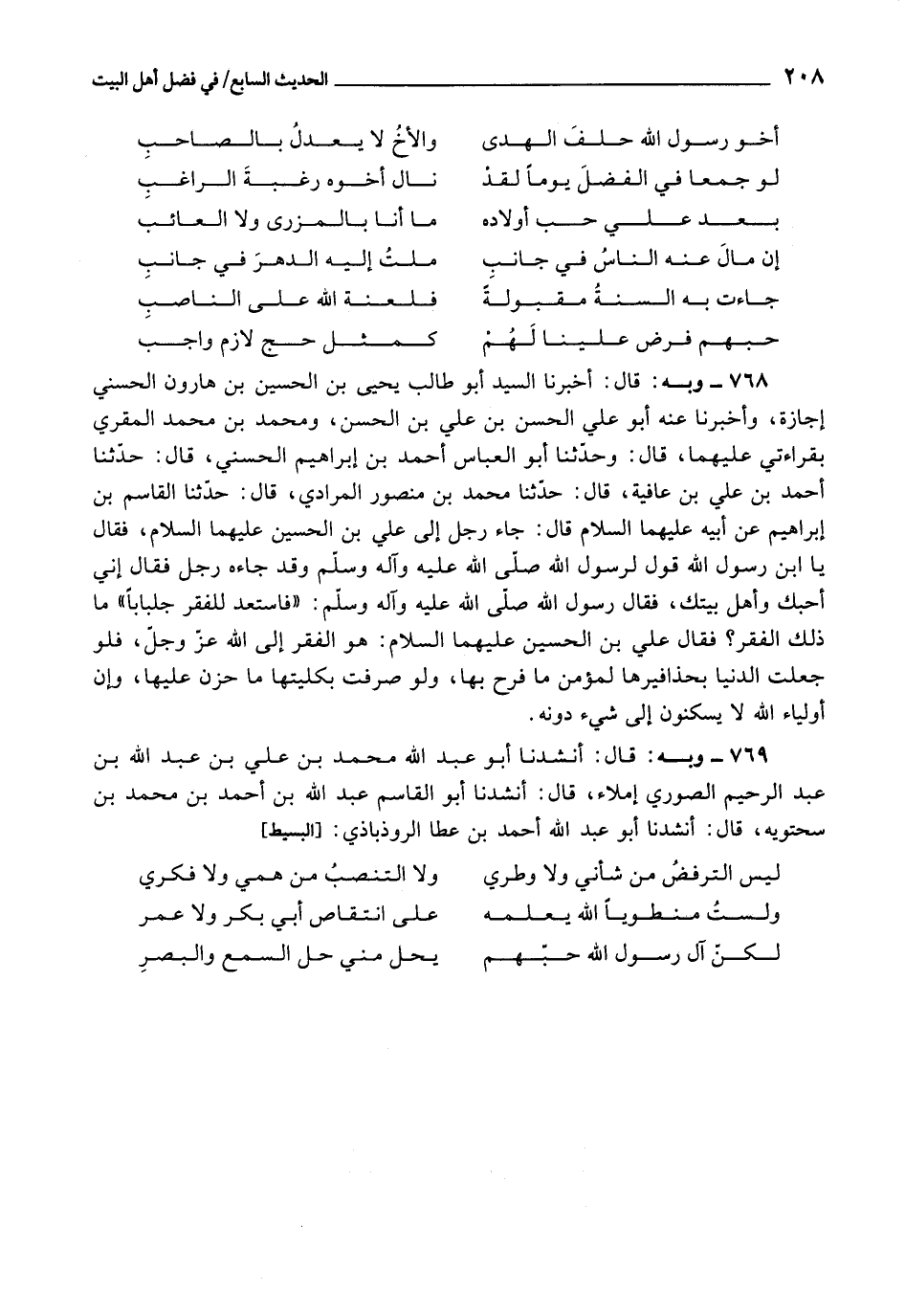 768 - أَخْبَرَنَا السَّيِّدُ أَبُو طَالِبٍ يَحْيَى بْنُ الْحُسَيْنِ بْنِ هَارُونَ الْحَسَنِيُّ، إِجَازَةً، وَأَخْبَرَنَا عَنْهُ ابْنُ عَلِيٍّ الْحَسَنُ بْنُ عَلِيِّ بْنِ الْحَسَنِ، وَمُحَمَّدُ بْنُ مُحَمَّدٍ الْمُقْرِيُّ، بِقِرَاءَتِي عَلَيْهِمَا، قَالَ: وَحَدَّثَنَا أَبُو الْعَبَّاسِ أَحْمَدُ بْنُ إِبْرَاهِيمَ الْحَسَنِيُّ، قَالَ: حَدَّثَنَا أَحْمَدُ بْنُ عَلِيِّ بْنِ عَافِيَةَ، قَالَ: حَدَّثَنَا مُحَمَّدُ بْنُ مَنْصُورٍ الْمُرَادِيُّ، قَالَ: حَدَّثَنَا الْقَاسِمُ ابْنُ إِبْرَاهِيمَ، عَنْ أَبِيهِ عَلَيْهِمَا السَّلَامُ، قَالَ: جَاءَ رَجُلٌ إِلَى عَلِيِّ بْنِ الْحُسَيْنِ عَلَيْهِمَا السَّلَامُ، فَقَالَ: يَابْنَ ابْنَ رَسُولِ اللَّهِ قَوْلٌ لِرَسُولِ اللَّهِ صَلَّى اللَّهُ عَلَيْهِ وَآلِهِ وَسَلَّمَ وَقَدْ جَاءَهُ رَجُلٌ فَقَالَ: إِنِّي أُحِبُّكَ وَأَهْلَ بَيْتِكَ، فَقَالَ رَسُولُ اللَّهِ صَلَّى اللَّهُ عَلَيْهِ وَآلِهِ وَسَلَّمَ: «فَاسْتَعِدْ لِلِفَقْرِ جِلْبَابًا» مَا ذَلِكَ الْفَقْرُ؟ فَقَالَ عَلِيُّ بْنُ الْحُسَيْنِ عَلَيْهِمُ السَّلَامُ، هُوَ الْفَقْرُ إِلَى اللَّهِ عَزَّ وَجَلَّ، فَلَوْ جُعِلَتِ الدُّنْيَا بِحَذَافِيرِهَا لِمُؤْمِنٍ مَا فَرِحَ بِهَا، وَلَوْ صُرِفَتْ بِكُلِّيَّتِهَا مَا حَزِنَ عَلَيْهَا، وَإِنَّ أَوْلِيَاءَ اللَّهِ لَا يَسْكُنُونَ إِلَى شَيْءٍ دُونَهُ