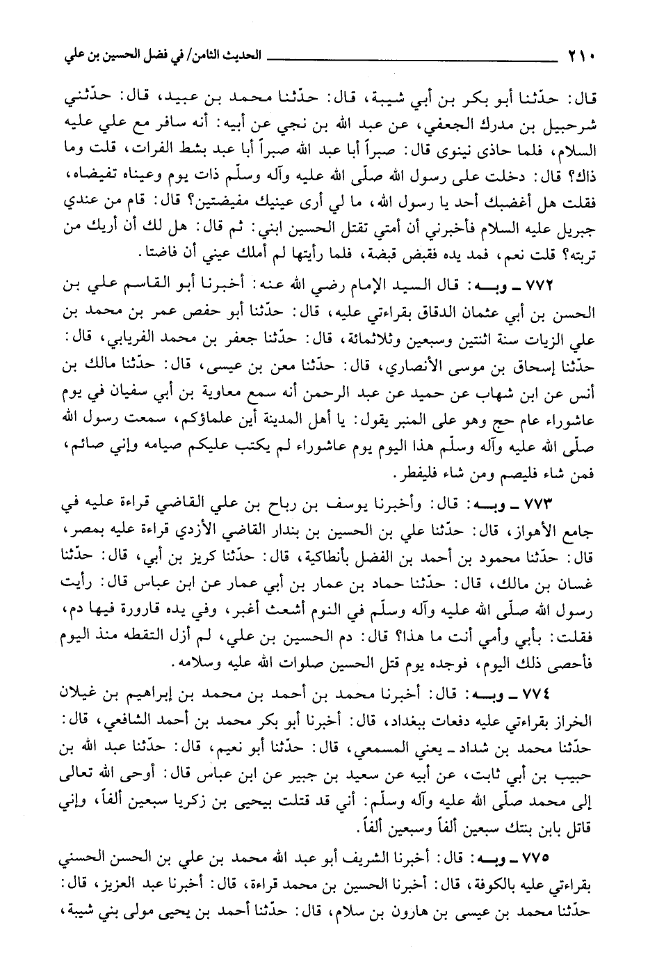 773 - وَأَخْبَرَنَا يُوسُفُ بْنُ رَبَاحِ بْنِ عَلِيٍّ الْقَاضِي، قِرَاءَةً عَلَيْهِ فِي جَامِعِ الْأَهْوَازِ، قَالَ: حَدَّثَنَا عَلِيُّ بْنُ الْحُسَيْنِ بْنِ بُنْدَارٍ الْقَاضِي الْأَزْدِيُّ، قِرَاءَةً عَلَيْهِ بِمِصْرَ، قَالَ: حَدَّثَنَا مَحْمُودُ بْنُ أَحْمَدَ بْنِ الْفَضْلِ، بِأَنْطَاكِيَةَ، قَالَ: حَدَّثَنَا كُرَيْزُ بْنُ أُبَيٍّ، قَالَ: حَدَّثَنَا غَسَّانُ بْنُ مَالِكٍ، قَالَ: حَدَّثَنَا حَمَّادُ بْنُ عَمَّارِ بْنِ أَبِي عَمَّارٍ، عَنِ ابْنِ عَبَّاسٍ، قَالَ: رَأَيْتُ رَسُولَ اللَّهِ صَلَّى اللَّهُ عَلَيْهِ وَآلِهِ وَسَلَّمَ فِي النَّوْمِ أَشْعَثَ أَغْبَرَ، وَفِي يَدِهِ قَارُورَةٌ فِيهَا دَمٌ، فَقُلْتُ: بِأَبِي وَأُمِّي مَا هَذَا؟ قَالَ: «دَمُ الْحُسَيْنِ بْنِ عَلِيٍّ» ، لَمْ أَزَلْ أَلْتَقِطُهُ مُنْذُ الْيَوْمِ فَأَحْصَى ذَلِكَ الْيَوْمَ، فَوَجَدَهُ يَوْمَ قَتْلِ الْحُسَيْنِ صَلَوَاتُ اللَّهِ عَلَيْهِ وَسَلَامُهُ