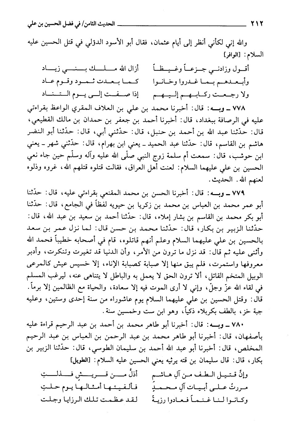 780 - أَخْبَرَنَا أَبُو طَاهِرِ بْنِ أَحْمَدَ بْنِ مُحَمَّدِ بْنِ عَبْدِ الرَّحِيمِ، قِرَاءَةً عَلَيْهِ بِأَصْفَهَانَ، قَالَ: أَخْبَرَنَا أَبُو طَاهِرٍ مُحَمَّدُ بْنُ عَبْدِ الرَّحْمَنِ بْنِ الْعَبَّاسِ بْنِ عَبْدِ الرَّحِيمِ الْمُخْلِصُ، قَالَ: أَخْبَرَنَا أَبُو عَبْدِ اللَّهِ أَحْمَدُ بْنُ سُلَيْمَانَ الطُّوسِيُّ، قَالَ: حَدَّثَنَا الزُّبَيْرُ بْنُ بَكَّارٍ، قَالَ: قَالَ سُلَيْمَانُ بْنُ قَتَهٍ يَرْثِيهِ يَعْنِي الْحُسَيْنَ عَلَيْهِ السَّلَامُ: «