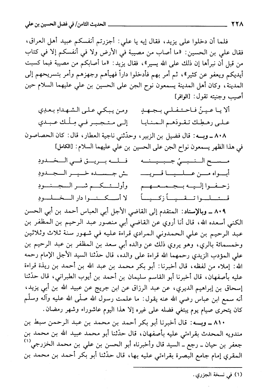 قَالَ فُضَيْلُ بْنُ الزُّبَيْرِ، وَحَدَّثَنِي نَاجِيَةُ الْعَطَّارُ، قَالَ» كَانَ الْحَصَّاصُونَ فِي هَذَا الظُّهْرِ يَسْمَعُونَ نُوَاحَ الْجِنِّ عَلَى الْحُسَيْنِ بْنِ عَلِيٍّ، عَلَيْهِمَا السَّلَامُ: مَسَحَ النَّبِيُّ جَبِينَهُ فَلَهُ بَرِيقٌ فِي الْخُدُودِ أَبَوَاهُ مِنْ عُلْيَا قُرَيْشٍ جَدُّهُ خَيْرُ الْجُدُودِ زَحَفُوا إِلَيْهِ بِجَمْعِهِمْ وَأُولَئِكُمْ شَرُّ الْجُنُودِ قَتَلُوا تَقِيًّا زَكِيًّا لَا أُسْكِنُوا دَارَ الْخُلُودِ ".
