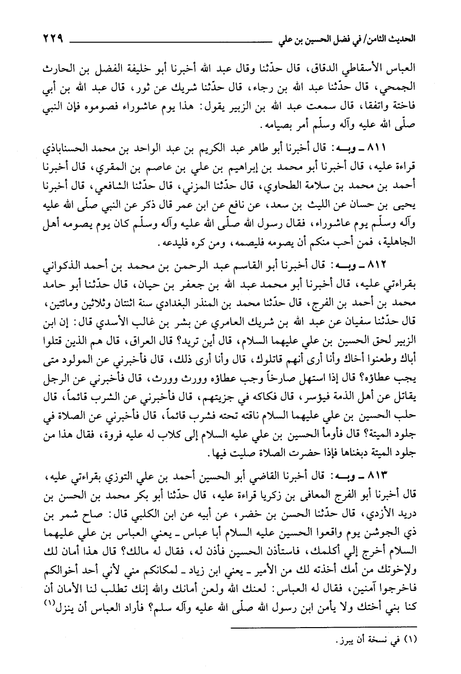812 - أَخْبَرَنَا أَبُو الْقَاسِمِ عَبْدُ الرَّحْمَنِ بْنُ مُحَمَّدِ بْنِ أَحْمَدَ الذَّكْوَانِيُّ، بِقِرَاءَتِي عَلَيْهِ، قَالَ: أَخْبَرَنَا أَبُو مُحَمَّدٍ عَبْدُ اللَّهِ بْنُ جَعْفَرِ بْنِ حَيَّانَ، قَالَ: حَدَّثَنَا أَبُو حَامِدٍ مُحَمَّدُ بْنُ أَحْمَدَ بْنِ الْفَرَجِ، قَالَ: حَدَّثَنَا مُحَمَّدُ بْنُ الْمُنْذِرِ الْبَغْدَادِيُّ، سَنَةَ اثْنَتَانِ وَثَلَاثِينَ وَمِائَتَيْنِ، قَالَ: حَدَّثَنَا سُفْيَانُ، عَنْ عَبْدِ اللَّهِ بْنِ شَرِيكٍ الْعَامِرِيِّ، عَنْ بِشْرِ بْنِ غَالِبٍ الْأَسَدِيِّ، قَالَ: " إِنَّ ابْنَ الزُّبَيْرِ لَحِقَ الْحُسَيْنَ بْنَ عَلِيٍّ، عَلَيْهِمَا السَّلَامُ، قَالَ: أَيْنَ تُرِيدُ؟ قَالَ: الْعِرَاقَ، قَالَ: هُمُ الَّذِينَ قَتَلُوا أَبَاكَ وَطَعَنُوا أَخَاكَ وَأَنَا، أَرَى أَنَّهُمْ قَاتِلُوكَ، قَالَ: وَأَنَا أَرَى ذَلِكَ، قَالَ فَأَخْبِرْنِي عَنِ الْمَوْلُودِ مَتَى يَجِبُ عَطَاؤُهُ؟ قَالَ إِذَا اسْتَهَلَّ صَارِخًا وَجَبَ عَطَاؤُهُ وَوَرِثَ، قَالَ فَأَخْبِرْنِي عَنِ الرَّجُلِ يُقَاتِلُ عَنْ أَهْلِ الذِّمَّةِ فَيُؤْسَرُ، قَالَ: فِكَاكُهُ فِي جِزْيَتِهِمْ، قَالَ: فَأَخْبِرْنِي عَنِ الشُّرْبِ قَائِمًا، قَالَ: حَلَبَ الْحُسَيْنُ بْنُ عَلِيٍّ، عَلَيْهِمَا السَّلَامُ نَاقَتَهُ تَحْتَهُ فَشَرِبَ قَائِمًا، قَالَ فَأَخْبِرْنِي عَنِ الصَّلَاةِ فِي جُلُودِ الْمَيْتَةِ؟ قَالَ: فَأَوْمَأَ الْحُسَيْنُ بْنُ عَلِيٍّ، عَلَيْهِمَا السَّلَامُ إِلَى كَلْبٍ لَهُ عَلَيْهِ فَرْوَةٌ، فَقَالَ: هَذَا مِنْ جُلُوِد الْمَيْتَةِ دَبَغْنَاهَا فَإِذَا حَضَرَتِ الصَّلَاةُ صَلَّيْتُ عَلَيْهَا "