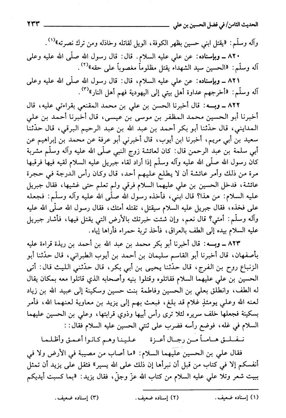 820 - وَبِإِسْنَادِهِ، عَنْ عَلِيٍّ السَّلَامُ، قَالَ: قَالَ رَسُولُ اللَّهِ صَلَّى اللَّهُ عَلَيْهِ وَآلِهِ وَسَلَّمَ: «الْحُسَيْنُ سَيِّدُ الشُّهَدَاءِ يُقْتَلُ مَظْلُومًا مَغْصُوبًا عَلَى حَقِّهِ»