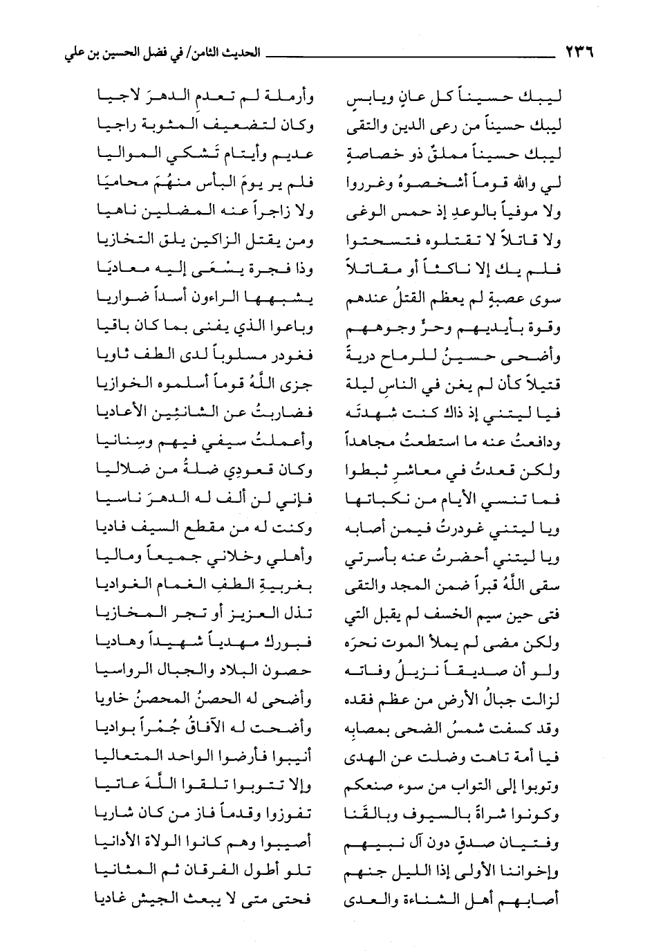 لِيَبْكِ حُسَيْنًا مُمْلِقٌ ذُو خَصَاصَةٍ ... عَدِيمٌ وَأَيْتَامٌ تَشَكَّى الْمَوَالِيَا
