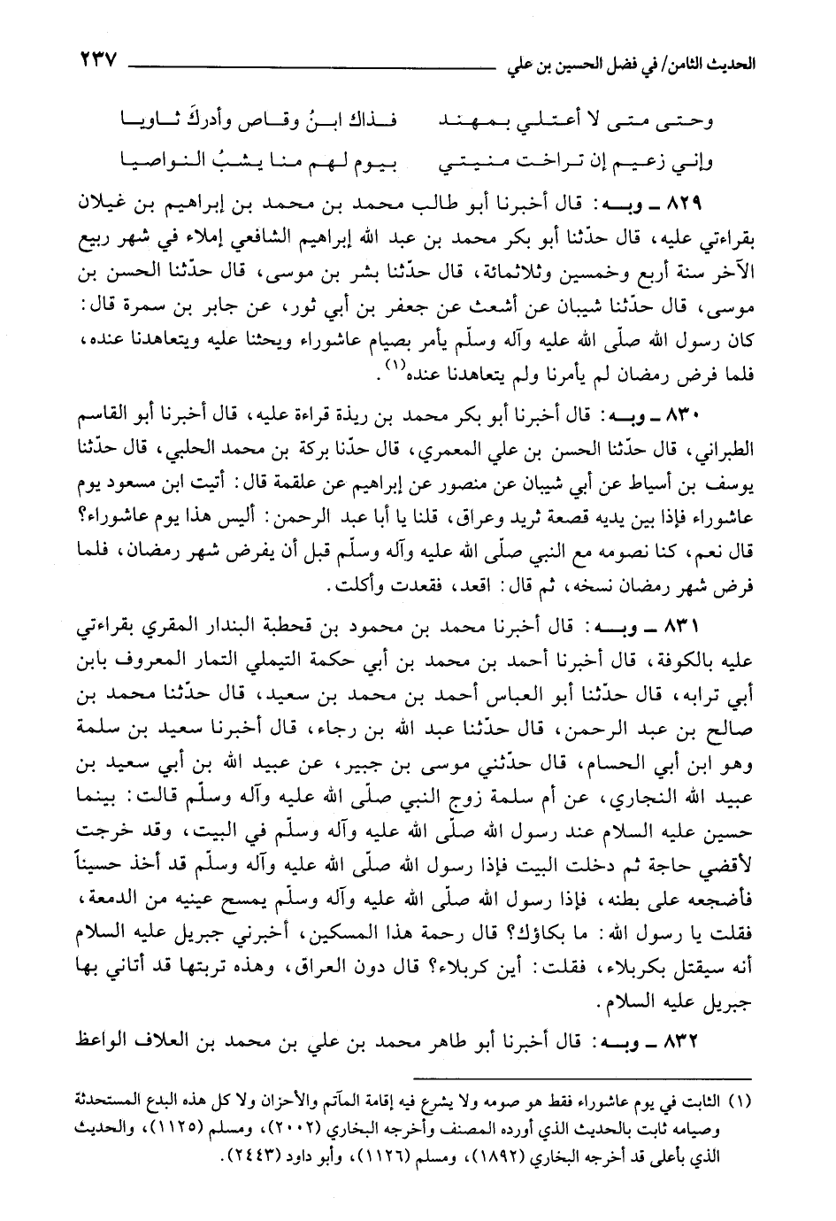 831 - أَخْبَرَنَا مُحَمَّدُ بْنُ مَحْمُودِ بْنِ قَحْطَبَةَ الْبُنْدَارُ الْمُقْرِيُّ، بِقِرَاءَتِي عَلَيْهِ بِالْكُوفَةِ، قَالَ: أَخْبَرَنَا أَحْمَدُ بْنُ مُحَمَّدِ بْنِ أَبِي حِكْمَةَ التَّيْمَلِيُّ التَّمَّارُ الْمَعْرُوفُ بِابْنِ أَبِي تُرَابَةَ، قَالَ: حَدَّثَنَا أَبُو الْعَبَّاسُ أَحْمَدُ بْنُ مُحَمَّدِ بْنِ سَعِيدٍ، قَالَ: حَدَّثَنَا مُحَمَّدُ بْنُ صَالِحِ بْنِ عَبْدِ الرَّحْمَنِ، قَالَ: حَدَّثَنَا عَبْدُ اللَّهِ بْنُ رَجَاءٍ، قَالَ: أَخْبَرَنَا سَعِيدُ بْنُ سَلَمَةَ وَهُوَ ابْنُ أَبِي الْحُسَامِ، قَالَ: حَدَّثَنِي مُوسَى بْنُ جُبَيْرٍ، عَنْ عُبَيْدِ اللَّهِ بْنِ أَبِي سَعِيدِ بْنِ عُبَيْدِ اللَّهِ النَّجَّارِيِّ، عَنْ أُمِّ سَلَمَةَ زَوْجِ النَّبِيِّ صَلَّى اللَّهُ عَلَيْهِ وَآلِهِ وَسَلَّمَ، قَالَتْ: بَيْنَمَا حُسَيْنٌ عَلَيْهِ السَّلَامُ عِنْدَ رَسُولِ اللَّهِ صَلَّى اللَّهُ عَلَيْهِ وَآلِهِ وَسَلَّمَ فِي الْبَيْتِ، وَقَدْ خَرَجْتُ لِأَقْضِيَ حَاجَةً ثُمَّ دَخَلْتُ الْبَيْتَ فَإِذَا رَسُولُ اللَّهِ صَلَّى اللَّهُ عَلَيْهِ وَآلِهِ وَسَلَّمَ قَدْ أَخَذَ حُسَيْنًا فَأَضْجَعَهُ عَلَى بَطْنِهِ، فَإِذَا رَسُولُ اللَّهِ صَلَّى اللَّهُ عَلَيْهِ وَآلِهِ وَسَلَّمَ يَمْسَحُ عَيْنَيْهِ مِنَ الدَّمْعَةِ، فَقُلْتُ: يَا رَسُولَ اللَّهِ، مَا بُكَاؤُكَ؟ قَالَ: «رَحْمَةُ هَذَا الْمِسْكِينِ، أَخْبَرَنِي جِبْرِيلُ عَلَيْهِ السَّلَامُ أَنَّهُ سَيُقْتَلُ بِكَرْبُلَاءَ» ، فَقُلْتُ: أَيْنَ كَرْبَلَاءُ؟ قَالَ: «دُونَ الْعِرَاقِ، وَهَذِهِ تُرْبَتُهَا قَدْ أَتَانِي بِهَا جِبْرِيلُ عَلَيْهِ السَّلَامُ»