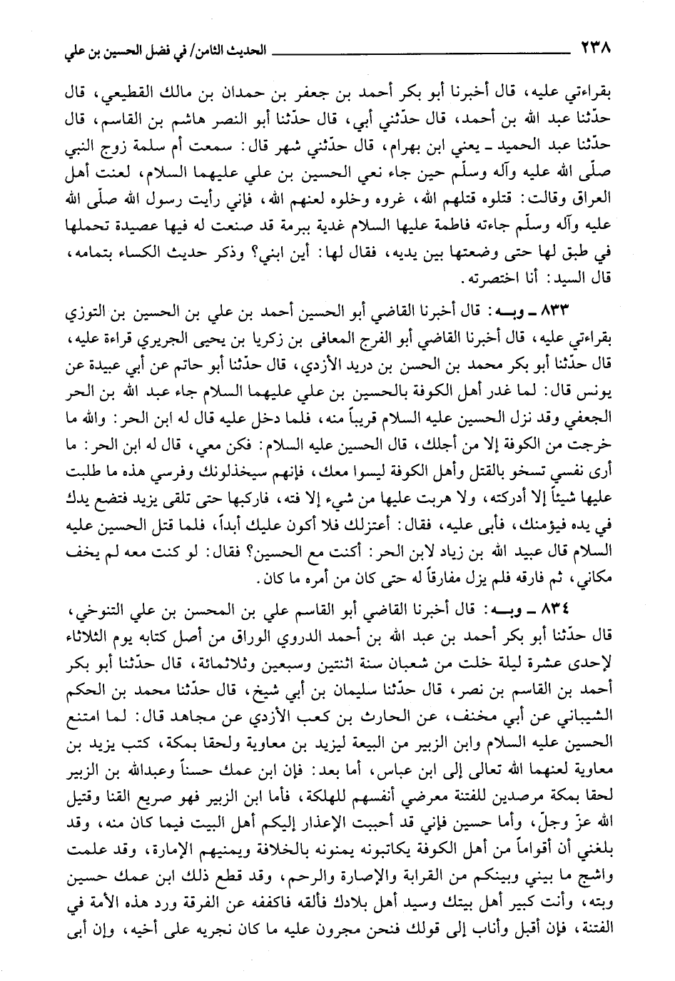 بِقِرَاءَتِي عَلَيْهِ، قَالَ: أَبُو بَكْرٍ أَحْمَدُ بْنُ جَعْفَرِ بْنِ حَمْدَانَ بْنِ مَالِكٍ الْقَطِيعِيُّ، قَالَ: حَدَّثَنَا عَبْدُ اللَّهِ بْنُ أَحْمَدَ، قَالَ: حَدَّثَنِي أَبِي، قَالَ: حَدَّثَنَا أَبُو النَّصْرِ هَاشِمُ بْنُ الْقَاسِمِ، قَالَ: حَدَّثَنَا عَبْدُ الْحَمِيدِ يَعْنِي ابْنَ بَهْرَامَ، قَالَ: حَدَّثَنِي شَهْرٌ، قَالَ: سَمِعْتُ أُمَّ سَلَمَةَ زَوْجَ النَّبِيِّ صَلَّى اللَّهُ عَلَيْهِ وَآلِهِ وَسَلَّمَ حِينَ جَاءَ نَعْيُ الْحُسَيْنِ بْنِ عَلِيٍّ، عَلَيْهِمَا السَّلَامُ، لَعَنَتْ أَهْلَ الْعِرَاقِ، وَقَالَتْ: قَتَلُوهُ قَتَلَهُمُ اللَّهُ، غَرُّوهُ وَخَلُّوهُ لَعَنَهُمُ اللَّهُ، فَإِنِّي رَأَيْتُ رَسُولَ اللَّهِ صَلَّى اللَّهُ عَلَيْهِ وَآلِهِ وَسَلَّمَ جَاءَتْهُ فَاطِمَةُ عَلَيْهَا السَّلَامُ غَدِيَّةً بِبُرْمَةٍ قَدْ صَنَعَتْ لَهُ فِيهَا عَصِيدَةً تَحْمِلُهَا فِي طَبَقٍ لَهَا حَتَّى وَضَعَتْهَا بَيْنَ يَدَيْهِ، فَقَالَ لَهَا: «أَيْنَ ابْنِي؟» ، وَذَكَرَ حَدِيثَ الْكِسَاءِ بِتَمَامِهِ، قَالَ السَّيِّدُ: أَنَا اخْتَصَرْتُهُ
