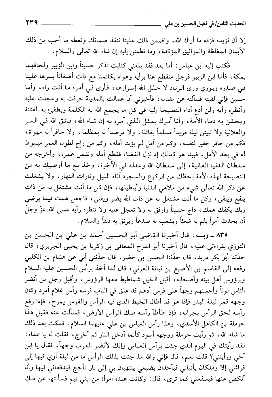 835 - أَخْبَرَنَا الْقَاضِي أَبُو الْحُسَيْنِ أَحْمَدُ بْنُ عَلِيِّ بْنِ الْحُسَيْنِ بْنِ التَّوَّزِيِّ، بِقِرَاءَتِي عَلَيْهِ، قَالَ: أَخْبَرَنَا أَبُو الْفَرَجِ الْمُعَافَى بْنُ زَكَرِيَّا بْنِ يَحْيَى الْجَرِيرِيُّ، قَالَ: حَدَّثَنَا أَبُو بَكْرٍ دُرَيْدٌ، قَالَ: حَدَّثَنَا الْحَسَنُ بْنُ خِضْرٍ، قَالَ: حَدَّثَنِي أَبِي، عَنْ هِشَامِ بْنِ الْكَلْبِيِّ، رَفَعَهُ إِلَى الْقَاسِمِ بْنِ الْأَصْبَغِ بْنِ نُبَاتَةَ الْعُرَنِيِّ، قَالَ: لَمَّا أُخِذَ بِرَأْسِ الُحَسْيِن عَلَيْهِ السَّلَامُ وَبِرُءُوسِ أَهْلِ بَيْتِهِ وَأَصْحَابِهِ، أَقْبَلَ الْخَيْلُ شَمَاطِيطَ مَعَهَا الرُّءُوسُ، وَأَقْبَلَ رَجُلٌ مِنْ أَنْضَرِ النَّاسِ لَوْنًا وَأَحْسَنِهِمْ وَجْهًا عَلَى فَرَسٍ أَدْهَمَ قَدْ عُلِّقَ فِي لَبَبِ فَرَسِهِ رَأْسُ غُلَامٍ أَمْرَدَ وَكَانَ وَجْهَهُ قَمْرٌ لَيْلَةَ الْبَدْرِ فَإِذَا هُوَ قَدْ أَطَالَ الْخَيْطَ الَّذِي فِيهِ الرَّأْسُ وَالْفَرَسُ يَمْرَحُ، فَإِذَا رَفَعَ رَأْسَهُ لَحِقَ الرَّأْسُ بِجِرَانِهِ، فَإِذَا طَأْطَأَ رَأْسَهُ صَكَّ الرَّأْسُ الْأَرْضَ، فَسَأَلْتُ عَنْهُ فَقِيلَ هَذَا حَرْمَلَةُ بْنُ الْكَاهِلِ الْأَسَدِيُّ، وَهَذَا رَأْسُ الْعَبَّاسِ بْنِ عَلِيٍّ، عَلَيْهِمَا السَّلَامُ.
