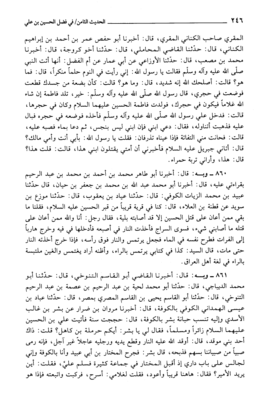 الْمُقْرِيُّ صَاحِبُ الْكِنَانِيِّ الْمُقْرِيُّ، قَالَ: أَخْبَرَنَا أَبُو حَفْصِ بْنُ أَحْمَدَ بْنِ إِبْرَاهِيمَ الْكِنَانِيُّ، قَالَ: حَدَّثَنَا الْقَاضِي الْمَحَامِلِيُّ، قَالَ: حَدَّثَنَا أَخُو كَرُوجَةَ، قَالَ: أَخْبَرَنَا مُحَمَّدُ بْنُ مُصْعَبٍ، قَالَ: حَدَّثَنَا الْأَوْزَاعِيُّ، عَنْ أَبِي عَمَّارٍ، عَنْ أُمِّ الْفَضْلِ، أَنَّهَا أَتَتِ النَّبِيَّ صَلَّى اللَّهُ عَلَيْهِ وَآلِهِ وَسَلَّمَ فَقَالَتْ: يَا رَسُولَ اللَّهِ، إِنِّي رَأَيْتُ فِي النَّوْمِ حُلْمًا مُنْكَرًا، قَالَ: «فَمَا هُوَ؟» ، قَالَتْ: أَصْلَحَكَ اللَّهُ إِنَّهُ شَدِيدٌ، قَالَ: «وَمَا هُوَ؟» ، قَالَتْ: كَأَنَّ بِضْعَةً مِنْ جَسَدِكَ قُطِعَتْ فَوُضِعَتْ فِي حِجْرِي، قَالَ رَسُولُ اللَّهِ صَلَّى اللَّهُ عَلَيْهِ وَآلِهِ وَسَلَّمَ: «خَيْرٌ، تَلِدُ فَاطِمَةُ إِنْ شَاءَ اللَّهُ غُلَامًا فَيَكُونُ فِي حِجْرِكِ، فَوَلَدَتْ فَاطِمَةُ الْحُسَيْنَ عَلَيْهِمَا السَّلَامُ وَكَانَ فِي حِجْرِهَا» ، قَالَتْ: فَدَخَلَ عَلَيَّ رَسُولُ اللَّهِ صَلَّى اللَّهُ عَلَيْهِ وَآلِهِ وَسَلَّمَ فَأَخَذَهُ فَوَضَعَهُ فِي حِجْرِهِ فَبَالَ عَلَيْهِ فَذَهَبْتُ أَتَنَاوَلُهُ، فَقَالَ: «دَعِي ابْنِي فَإِنَّ ابْنِي لَيْسَ بِنَجِسٍ» ، ثُمَّ دَعَا بِمَاءٍ فَصَبَّهُ عَلَيْهِ، قَالَتْ: فَحَانَتْ مِنِّي الْتِفَاتَةُ فَإِذَا عَيْنَاهُ تَذْرِفَانِ، فَقُلْتُ: يَا رَسُولَ اللَّهِ، بِأَبِي أَنْتَ وَأُمِّي مَالَكَ؟ قَالَ: «أَتَانِي جِبْرِيلُ عَلَيْهِ السَّلَامُ فَأَخْبَرَنِي أَنَّ أُمَّتِي يَقْتُلُونَ ابْنِي هَذَا» ، قَالَتْ: قُلْتُ هَذَا؟ قَالَ: «هَذَا، وَأَرَانِي تُرْبَةً حَمْرَاءَ»