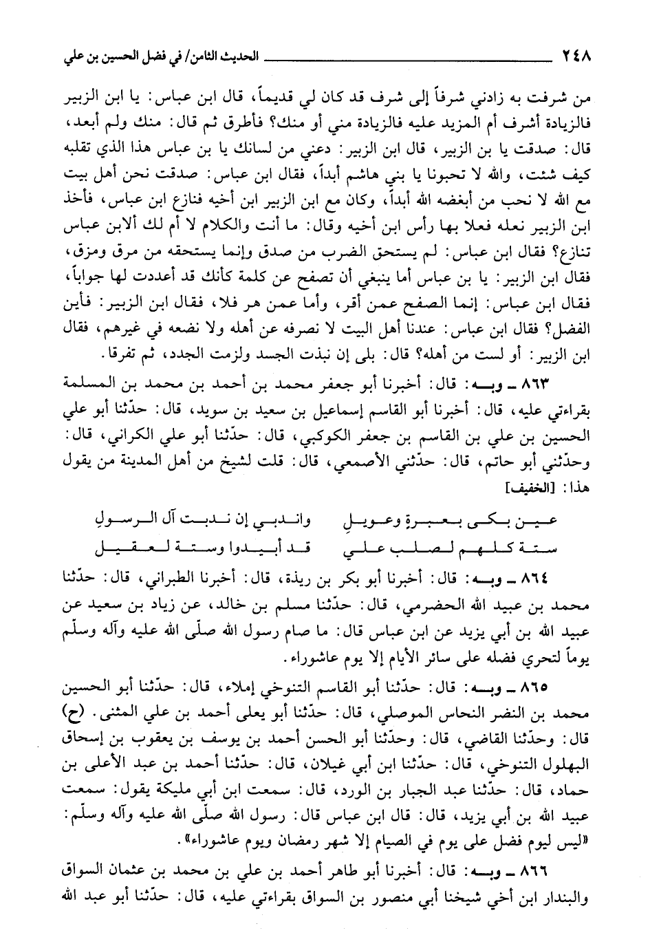 864 - أَخْبَرَنَا أَبُو بَكْرِ بْنُ رَيْذَةَ، قَالَ: أَخْبَرَنَا الطَّبَرَانِيُّ، قَالَ: حَدَّثَنَا مُحَمَّدُ بْنُ عُبَيْدِ اللَّهِ الْحَضْرَمِيُّ، قَالَ: حَدَّثَنَا مُسْلِمُ بْنُ خَالِدٍ، عَنْ زِيَادِ بْنِ سَعِيدٍ، عَنْ عُبَيْدِ اللَّهِ بْنِ أَبِي يَزِيدَ، عَنِ ابْنِ عَبَّاسٍ، قَالَ: «مَا صَامَ رَسُولُ اللَّهِ صَلَّى اللَّهُ عَلَيْهِ وَآلِهِ وَسَلَّمَ يَوْمًا لِتَحَرِّي فَضْلِهِ عَلَى سَائِرِ الْأَيَّامِ إِلَّا يَوْمَ عَاشُورَاءَ»