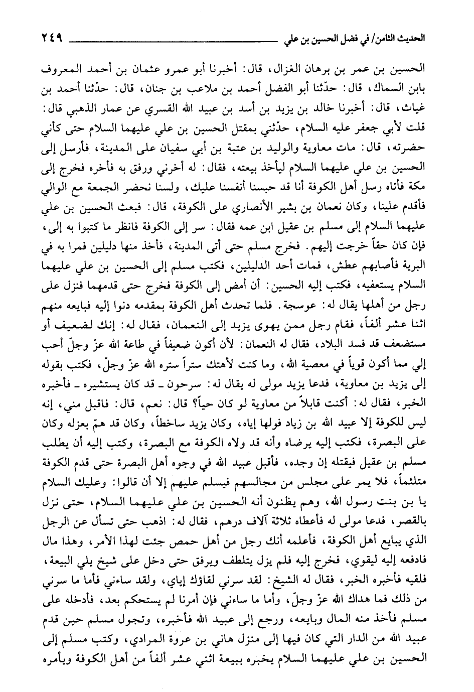 الْحُسَيْنُ بْنُ عُمَرَ بْنِ بُرْهَانَ الْغَزَّالُ، قَالَ: أَخْبَرَنَا أَبُو عَمْرٍو عُثْمَانُ بْنُ أَحْمَدَ الْمَعْرُوفُ بِابْنِ السَّمَّاكِ، قَالَ: حَدَّثَنَا أَبُو الْفَضْلِ أَحْمَدُ بْنُ مُلَاعِبِ بْنِ جَنَانٍ، قَالَ: حَدَّثَنَا أَحْمَدُ بْنُ غِيَاثٍ، قَالَ: أَخْبَرَنَا خَالِدُ بْنُ يَزِيدَ بْنِ أَسَدِ بْنِ عُبَيْدِ اللَّهِ الْقَسْرِيُّ، عَنْ عَمَّارٍ الذُّهْنِيِّ، قَالَ: قُلْتُ لِأَبِي جَعْفَرٍ، عَلَيْهِ السَّلَامُ، حَدِّثْنِي بِمَقْتَلِ الْحُسَيْنِ بْنِ عَلِيٍّ، عَلَيْهِمَا السَّلَامُ، حَتَّى كَأَنِّي حَضَرْتُهُ، قَالَ: " مَاتَ مُعَاوِيَةُ، وَالْوَلِيدُ بْنُ عُتْبَةَ بْنِ أَبِي سُفْيَانَ عَلَى الْمَدِينَةِ، فَأَرْسَلَ إِلَى الْحُسَيْنِ بْنِ عَلِيٍّ، عَلَيْهِمَا السَّلَامُ لِيَأْخُذَ بَيْعَتَهُ، فَقَالَ لَهُ: أَخِّرْنِي وَارْفُقْ بِي، فَأَخَّرَهُ، فَخَرَجَ إِلَى مَكَّةَ، فَأَتَاهُ رُسُلُ أَهْلِ الْكُوفَةِ أَنَّا قَدْ حَبَسْنَا أَنْفُسَنَا عَلَيْكَ، وَلَسْنَا نَحْضُرُ الْجُمُعَةَ مَعَ الْوَالِي فَأَقْدِمْ عَلَيْنَا، وَكَانَ نُعْمَانُ بْنُ بَشِيرٍ الْأَنْصَارِيُّ عَلَى الْكُوفَةِ، قَالَ: فَبَعَثَ الْحُسَيْنُ بْنُ عَلِيٍّ، عَلَيْهِمَا السَّلَامُ إِلَى مُسْلِمِ بْنِ عَقِيلِ ابْنِ عَمِّهِ، فَقَالَ: سِرْ إِلَى الْكُوفَةِ فَانْظُرْ مَا كَتَبُوا بِهِ إِلَيَّ، فَإِنْ كَانَ حَقًّا خَرَجْتُ إِلَيْهِمْ.