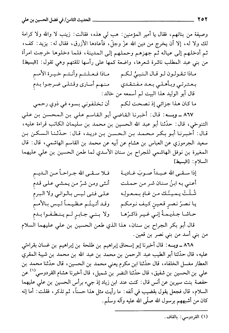 868 - أَخْبَرَنَا إِبْرَاهِيمُ بْنُ طَلْحَةَ بْنِ إِبْرَاهِيمَ بْنِ غَسَّانَ، بِقِرَاءَتِي عَلَيْهِ، قَالَ: حَدَّثَنَا أَبُو الطَّيِّبِ عَبْدُ الرَّحْمَنِ بْنُ مُحَمَّدِ بْنِ عَبْدِ اللَّهِ بْنِ مُحَمَّدِ بْنِ شَيْبَةَ الْمُقْرِيُّ الْعَطَّارُ مُغَسِّلُ الْخُلَفَاءِ، قَالَ: حَدَّثَنَا ابْنُ مُكْرَمٍ يَعْنِي مُحَمَّدَ بْنَ الْحُسَيْنِ، قَالَ: مُحَمَّدُ بْنُ عَلِيِّ بْنِ الْحُسَيْنِ بْنِ شَفِيقٍ، قَالَ: حَدَّثَنَا النَّضْرُ بْنُ شُمَيْلٍ، قَالَ: أَخْبَرَنَا هِشَامُ الْقُرْدُوسِيُّ، عَنْ حَفْصَةَ بِنْتِ سِيرِينَ، عَنْ أَنَسٍ، قَالَ: " كُنْتُ عِنْدَ ابْنِ زِيَادٍ إِذْ جِيءَ بِرَأْسِ الْحُسَيْنِ بْنِ عَلِيٍّ، عَلَيْهِمَا السَّلَامُ، قَالَ: فَجَعَلَ يَقُولُ بِقَضِيبٍ فِي أَنْفِهِ: مَا رَأَيْتُ مِثْلَ هَذَا حُسْنًا، ثُمَّ تَذَكَّرَ، فَقُلْتُ: أَمَا إِنَّهُ كَانَ مِنْ أَشْبَهِهِمْ بِرَسُولِ اللَّهِ صَلَّى اللَّهُ عَلَيْهِ وَآلِهِ وَسَلَّمَ "