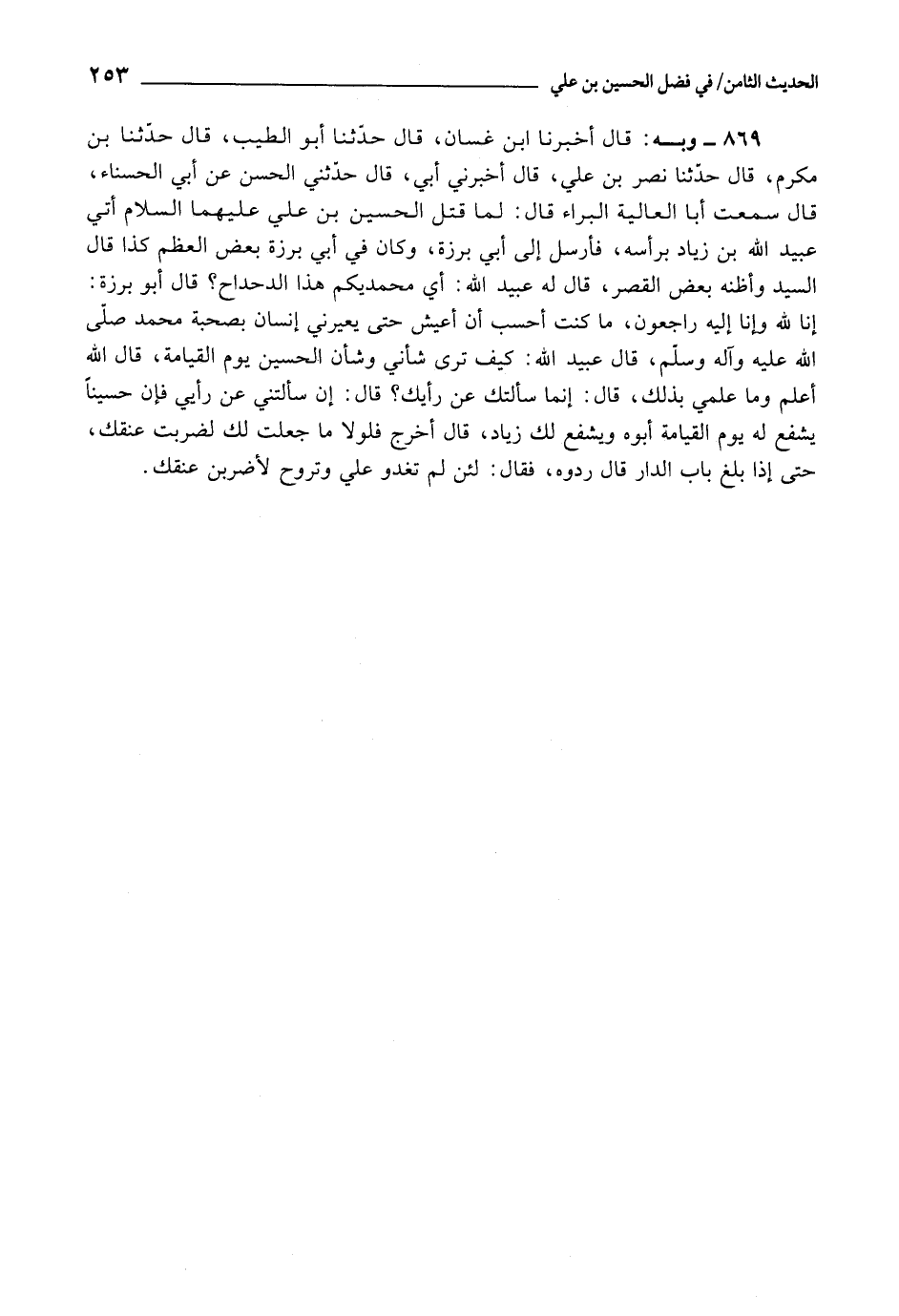 869 - أَخْبَرَنَا ابْنُ غَسَّانَ، قَالَ: حَدَّثَنَا أَبُو الطَّيِّبِ، قَالَ: حَدَّثَنَا ابْنُ مُكْرَمٍ، قَالَ: حَدَّثَنَا نَصْرُ بْنُ عَلِيٍّ، قَالَ: أَخْبَرَنِي أَبِي، قَالَ: حَدَّثَنَا الْحَسَنُ، عَنْ أَبِي الْحَسْنَاءِ، قَالَ: سَمِعْتُ أَبَا الْعَالِيَةِ الْبَرَّاءَ، قَالَ " لَمَّا قُتِلَ الْحُسَيْنُ بْنُ عَلِيٍّ، عَلَيْهِمَا السَّلَامُ أُتِيَ عُبَيْدُ اللَّهُ بْنُ زِيَادٍ بِرَأْسِهِ، فَأَرْسَلَ إِلَى أَبِي بَرْزَةَ، وَكَانَ فِي أَبِي بَرْزَةَ بَعْضُ الْعِظَمِ كَذَا قَالَ السَّيِّدُ: وَأَظُنُّهُ بَعْضَ الْقِصَرِ، قَالَ لَهُ عُبَيْدُ اللَّهُ: أَيُّ مُحَمَّدِيكُمْ هَذَا الدَّحْدَاحُ؟ قَالَ أَبُو بَرْزَةَ: إِنَّا لِلَّهِ وَإِنَّا إِلَيْهِ رَاجِعُونَ، مَا كُنْتُ أَحْسَبُ أَنْ أَعِيشَ حَتَّى يُعَيِّرَنِي إِنْسَانٌ بِصُحْبَةِ مُحَمَّدٍ صَلَّى اللَّهُ عَلَيْهِ وَآلِهِ وَسَلَّمَ، قَالَ عُبَيْدُ اللَّهِ: كَيْفَ تَرَى شَأْنِي وَشَأْنَ الْحُسَيْنِ يَوْمَ الْقِيَامَةِ، قَالَ: اللَّهُ أَعْلَمُ وَمَا عِلْمِي بِذَلِكَ، قَالَ: إِنَّمَا سَأَلْتُكَ عَنْ رَأْيِكَ؟ قَالَ: إِنْ سَأَلْتَنِي عَنْ رَأْيِي فِإِنَّ حُسَيْنًا يَشْفَعُ لَهُ يَوْمَ الْقِيَامَةِ أَبُوهُ وَيَشْفَعُ لَكَ زِيَادٌ، قَالَ: اخْرُجْ فَلَوْلَا مَا جَعَلْتُ لَكَ لَضَرَبْتُ عُنُقَكَ، حَتَّى إِذَا بَلَغَ بَابَ الدَّارِ قَالَ رُدُّوهُ، فَقَالَ: لَئِنْ لَمْ تَغْدُو عَلَيَّ وَتَرُوحُ لَأَضْرِبَنَّ عُنُقَكَ ".