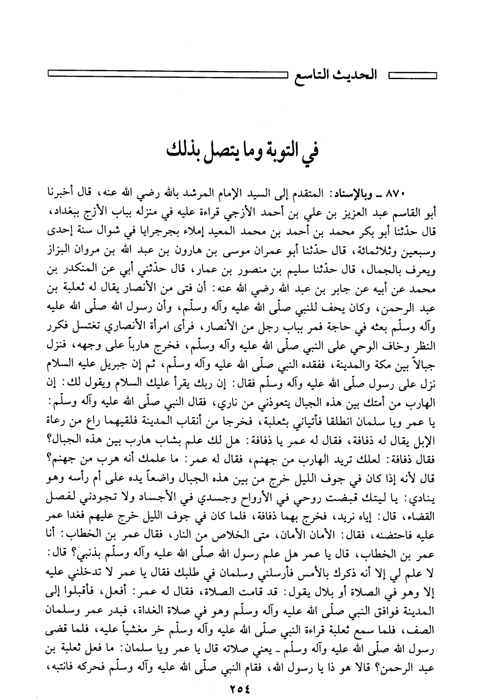870 - أَخْبَرَنَا أَبُو الْقَاسِمِ عَبْدُ الْعَزِيزِ بْنُ عَلِيِّ بْنِ أَحْمَدَ الْأَزَجِيُّ، قِرَاءَةً عَلَيْهِ فِي مَنْزِلِهِ بِبَابِ الْأَزَجِ بِبَغْدَادَ، قَالَ: حَدَّثَنَا أَبُو بَكْرٍ مُحَمَّدُ بْنُ أَحْمَدَ بْنِ مُحَمَّدٍ الْمُعِيدُ، إِمْلَاءً بِجَرْجَرَايَا فِي شَوَّالٍ سَنَةَ إِحْدَى وَسَبْعِينَ وَثَلاثِ مِائَةٍ، قَالَ: حَدَّثَنَا أَبُو عِمْرَانَ مُوسَى بْنُ هَارُونَ بْنِ عَبْدِ اللَّهِ بْنِ مَرْوَانَ الْبَزَّازُ وَيُعْرَفُ بِالْجَمَّالِ، قَالَ: حَدَّثَنَا سُلَيْمُ بْنُ مَنْصُورِ بْنِ عَمَّارٍ، قَالَ: حَدَّثَنِي أَبِي، عَنِ الْمُنْكَدِرِ بْنِ مُحَمَّدٍ، عَنْ أَبِي، عَنْ جَابِرِ بْنِ عَبْدِ اللَّهِ رَضِيَ اللَّهُ عَنْهُ أَنَّ فَتًى مِنَ الْأَنْصَارِ يُقَالُ لَهُ ثَعْلَبَةُ بْنُ عَبْدِ الرَّحْمَنِ، وَكَانَ يَحِفُّ لِلنَّبِيِّ صَلَّى اللَّهُ عَلَيْهِ وَآلِهِ وَسَلَّمَ، وَإِنَّ رَسُولَ اللَّهِ صَلَّى اللَّهُ عَلَيْهِ وَآلِهِ وَسَلَّمَ بَعَثَهُ فِي حَاجَةٍ فَمَرَّ بِبَابِ رَجُلٍ مِنَ الْأَنْصَارِ، فَرَأَى امْرَأةَ الْأَنْصَارِيِّ تَغْتَسِلُ فَكَرَّرَ النَّظَرَ، وَخَافَ الْوَحْيَ عَلَى النَّبِيِّ صَلَّى اللَّهُ عَلَيْهِ وَسَلَّمَ، ثُمَّ إِنَّ جِبْرِيلَ عَلَيْهِ السَّلَامُ نَزَلَ عَلَى رَسُولِ اللَّهِ صَلَّى اللَّهُ عَلَيْهِ وَآلِهِ وَسَلَّمَ، فَقَالَ: إِنَّ رَبَّكَ يَقْرَأُ عَلَيْكَ السَّلَامَ، وَيَقُولُ لَكَ: إِنَّ الْهَارِبَ مِنْ أُمَّتِكَ بَيْنَ هَذِهِ الْجِبَالِ يَتَعَوَّذُنِي مِنْ نَارِي، فَقَالَ النَّبِيُّ صَلَّى اللَّهُ عَلَيْهِ وَآلِهِ وَسَلَّمَ: «يَا عُمَرُ، وَيَا سَلْمَانُ، انْطَلَقَا فَأْتِيَانِي بِثَعْلَبَةَ» ، فَخَرَجَا مِنْ أَنْقَابِ الْمَدِينَةِ فَلَقِيَهُمَا رَاعٍ مِنْ رُعَاةِ الْإِبِلِ يُقَالُ لَهُ ذُفَافَةُ، فَقَالَ لَهُ عُمَرُ: يَا ذُفَافَةُ، هَلْ لَكَ عِلْمٌ بِشَابٍّ هَارِبٍ بَيْنَ هَذِهِ الْجِبَالِ؟ فَقَالَ ذُفَافَةُ: لَعَلَّكَ تُرِيدُ الْهَارِبَ مِنْ جَهَنَّمَ، فَقَالَ لَهُ عُمَرُ: مَا عِلْمُكَ أَنَّهُ هَرَبَ مِنْ جَهَنَّمَ؟ قَالَ: لِأَنَّهُ إِذْ كَانَ فِي جَوْفِ اللَّيْلِ خَرَجَ مِنْ بَيْنَ هَذِهِ الْجِبَالِ وَاضِعًا يَدَهُ عَلَى أُمِّ رَأْسِهِ وَهُوَ يُنَادِي: يَا لَيْتَكَ قَبَضْتَ رُوحِي فِي الرَّوَاحِ، وَجَسَدِي فِي الْأَجْسَادِ، وَلَا تُجَوِّدْنِي لِفَصْلِ الْقَضَاءِ، قَالَ: إِيهٍ نُرِيدُ، فَخَرَجَ بِهِمَا ذُفَافَةُ، فَلَمَّا كَانَ فِي جَوْفِ اللَّيْلِ خَرَجَ عَلَيْهِمْ، فَغَدَا عُمَرُ عَلَيْهِ فَاحْتَضَنَهُ، فَقَالَ: الْأَمَانَ