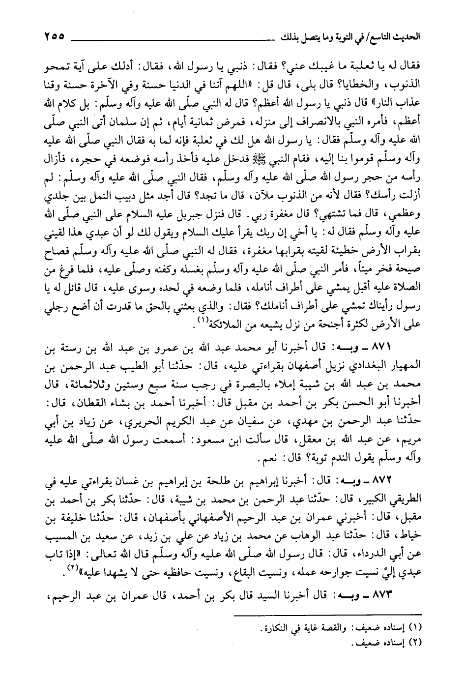 فَقَالَ لَهُ: «يَا ثَعْلَبَةُ، مَا غَيَّبَكَ عَنِّي؟» ، فَقَالَ: ذَنْبِي يَا رَسُولَ اللَّهِ، فَقَالَ: «أَدُلُّكَ عَلَى آيَةٍ تَمْحُو الذُّنُوبَ وَالْخَطَايَا؟» ، قَالَ بَلَى، قَالَ: " قُلْ: اللَّهُمَّ آتِنَا فِي الدُّنْيَا حَسَنَةً وَفِي الْآخِرَةِ حَسَنَةً وَقِنَا عَذَابَ النَّارِ "، قَالَ: ذَنْبِي يَا رَسُولَ اللَّهِ أَعْظَمُ، قَالَ لَهُ النَّبِيُّ صَلَّى اللَّهُ عَلَيْهِ وَآلِهِ وَسَلَّمَ: " بَلْ كَلَامُ اللَّهِ أَعْظَمُ، فَأَمَرَهُ النَّبِيُّ بالِانْصِرَافِ إِلَى مَنْزِلِهِ، فَمَرِضَ ثَمَانِيَةَ أَيَّامٍ، ثُمَّ إِنَّ سَلْمَانَ أَتَى النَّبِيَّ صَلَى اللَّهُ عَلَيْهِ وَآلِهِ وَسَلَّمَ، فَقَالَ: يَا رَسُولَ اللَّهِ، هَلْ لَكَ فِي ثَعْلَبَةَ فَإِنَّهُ لُمَّ بِهِ، فَقَالَ النَّبِيُّ صَلَّى اللَّهُ عَلَيْهِ وَآلِهِ وَسَلَّمَ: «قُومُوا بِنَا إِلَيْهِ» ، فَقَامَ النَّبِيُّ صَلَّى اللَّهُ عَلَيْهِ وَسَلَّمَ فَدَخَلَ عَلَيْهِ، فَأَخَذَ رَأْسَهُ فَوَضَعَهُ فِي حِجْرِهِ، فَأَزَالَ رَأْسَهُ مِنْ حِجْرِ رَسُولِ اللَّهِ صَلَّى اللَّهُ عَلَيْهِ وَآلِهِ وَسَلَّمَ، فَقَالَ النَّبِيُّ صَلَّى اللَّهُ عَلَيْهِ وَآلِهِ وَسَلَّمَ: «لِمَ أَزَلْتَ رَأْسَكَ؟» ، فَقَالَ: لِأَنَّهُ مِنَ الذُّنُوبِ مَلْآنُ، قَالَ: «مَا تَجِدُ؟» ، قَالَ: أَجِدُ مِثْلَ