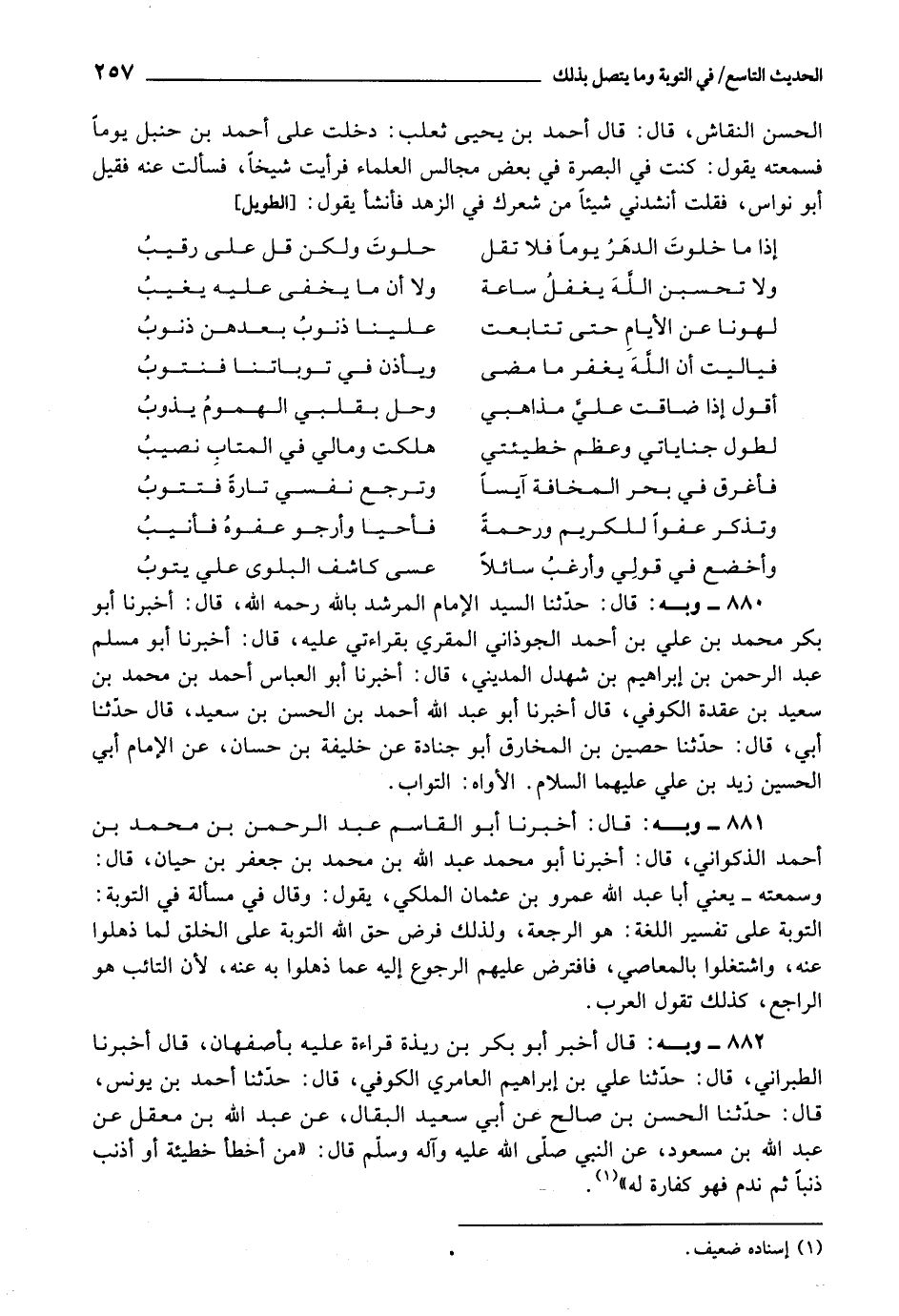 الْحَسَنِ النَّقَّاشُ، قَالَ: قَالَ أَحْمَدُ بْنُ يَحْيَى ثَعْلَبٌ " دَخَلْتُ عَلَى أَحْمَدَ بْنِ حَنْبلٍ يَوْمًا فَسَمِعْتُهُ يَقُولُ: كُنْتُ فِي الْبَصْرَةِ فِي بَعْضِ مَجَالِسِ الْعُلَمَاءِ فَرَأَيْتُ شَيْخًا، فَسَأَلْتُ عَنْهُ فَقِيلَ: أَبُو نُوَاسٍ، فَقُلْتُ: أَنْشِدْنِي شَيْئًا مِنْ شَعْرِكَ فِي الزُّهْدِ فَأَنْشَأَ يَقُولُ: