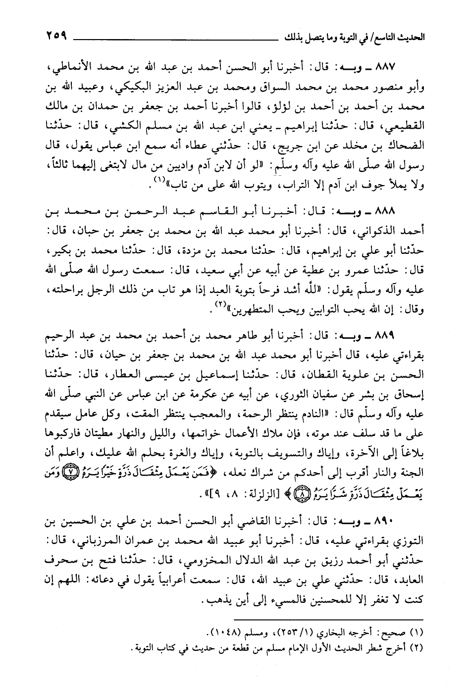 887 - أَخْبَرَنَا أَبُو الْحَسَنِ أَحْمَدُ بْنُ عَبْدِ اللَّهِ بْنِ مُحَمَّدٍ الْأَنْمَاطِيُّ، وَأَبُو مَنْصُورٍ مُحَمَّدُ بْنُ مُحَمَّدٍ السَّوَّاقُ، وَمُحَمَّدُ بْنُ عَبْدِ الْعَزِيزِ الْبَكِيكِيُّ، وَعُبَيْدُ اللَّهِ بْنُ مُحَمَّدِ بْنِ أَحْمَدَ بْنِ أَحْمَدَ بْنِ لُؤْلُؤٍ، قَالُوا: أَخْبَرَنَا أَبُو بَكْرٍ أَحْمَدُ بْنُ جَعْفَرِ بْنِ حَمْدَانَ بْنِ مَالِكٍ الْقَطِيعِيُّ، قَالَ: حَدَّثَنَا إِبْرَاهِيمُ يَعْنِي ابْنَ عَبْدِ اللَّهِ بْنِ مُسْلِمٍ الْكَشِّيَّ، قَالَ: حَدَّثَنَا الضَّحَّاكُ بْنُ مَخْلَدٍ، عَنِ ابْنِ جُرَيْجٍ، قَالَ: حَدَّثَنِي عَطَاءٌ، أَنَّهُ سَمِعَ ابْنَ عَبَّاسٍ يَقُولُ، قَالَ رَسُولُ اللَّهِ صَلَّى اللَّهُ عَلَيْهِ وَآلِهِ وَسَلَّمَ: «لَوْ أَنَّ لِابْنِ آدَمَ وَادِيَيْنِ مِنْ مَالٍ لَابْتَغَى إِلَيْهِمَا ثَالِثًا، وَلَا يَمْلَأُ جَوْفَ ابْنَ آدَمَ إِلَّا التُّرَابُ، وَيَتُوبُ اللَّهُ عَلَى مَنْ تَابَ»