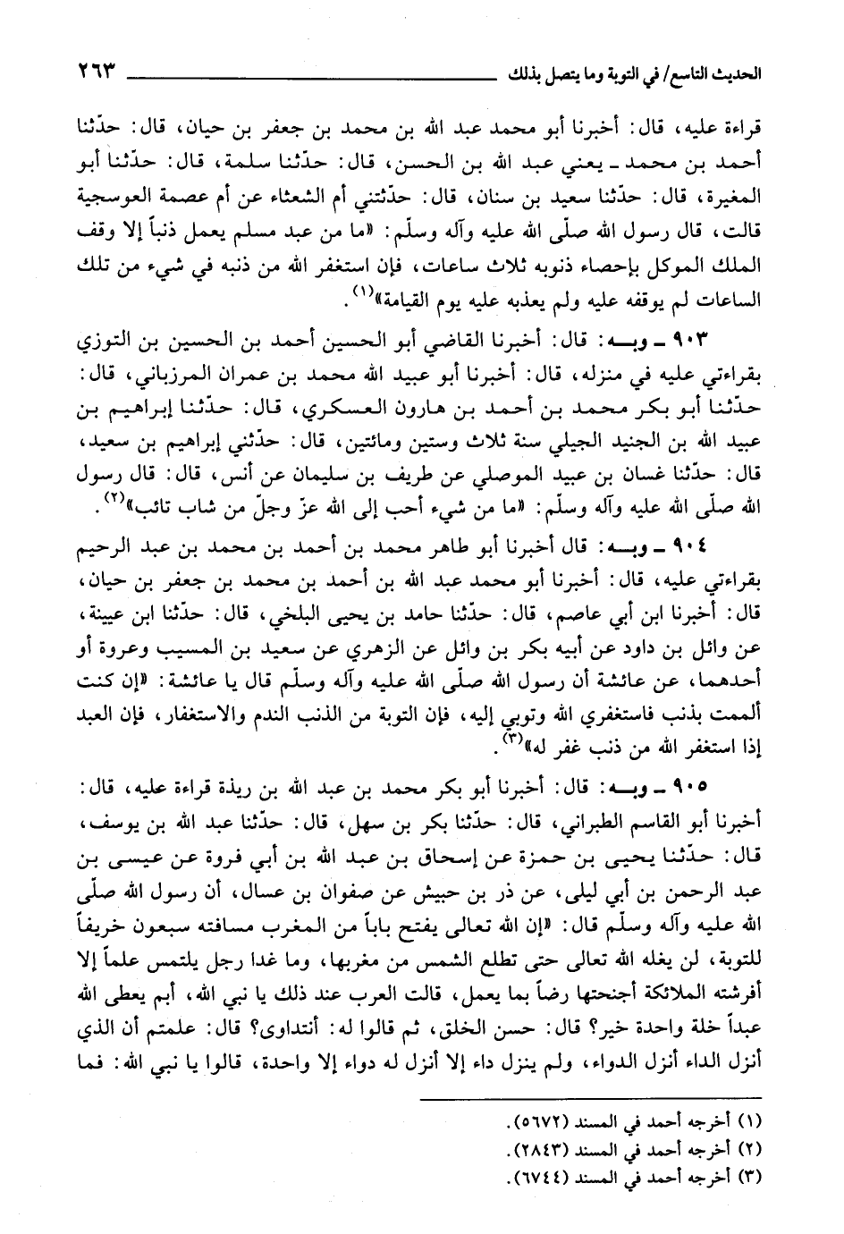 903 - أَخْبَرَنَا الْقَاضِي أَبُو الْحُسَيْنِ أَحْمَدُ بْنُ عَلِيِّ بْنِ الْحُسَيْنِ بْنِ التَّوَّزِيِّ، بِقِرَاءَتِي عَلَيْهِ فِي مَنْزِلِهِ، قَالَ: أَخْبَرَنَا أَبُو عُبَيْدِ اللَّهِ بْنُ عِمْرَانَ الْمَرْزُبَانِيُّ، قَالَ: حَدَّثَنَا أَبُو بَكْرٍ مُحَمَّدُ بْنُ أَحْمَدَ بْنِ هَارُونَ الْعَسْكَرِيُّ، قَالَ: حَدَّثَنَا إِبْرَاهِيمُ بْنُ عُبَيْدِ اللَّهِ بْنِ الْجُنَيْدِ الْبَجَلِيُّ، سَنَةَ ثَلَاثٍ وَسِتِّينَ وَمِائَتَيْنِ، قَالَ: حَدَّثَنِي إِبْرَاهِيمُ بْنُ سَعِيدٍ، قَالَ: حَدَّثَنَا غَسَّانُ بْنُ عُبَيْدٍ الْمَوْصِلِيُّ، عَنْ طَرِيفِ بْنِ سُلَيْمَانَ، عَنْ أَنَسٍ، قَالَ: قَالَ رَسُولُ اللَّهِ صَلَّى اللَّهُ عَلَيْهِ وَآلِهِ وَسَلَّمَ: «مَا مِنْ شَيْءٍ أَحَبُّ إِلَى اللَّهِ عَزَّ وَجَلَّ مِنْ شَابٍّ تَائِبٍ»