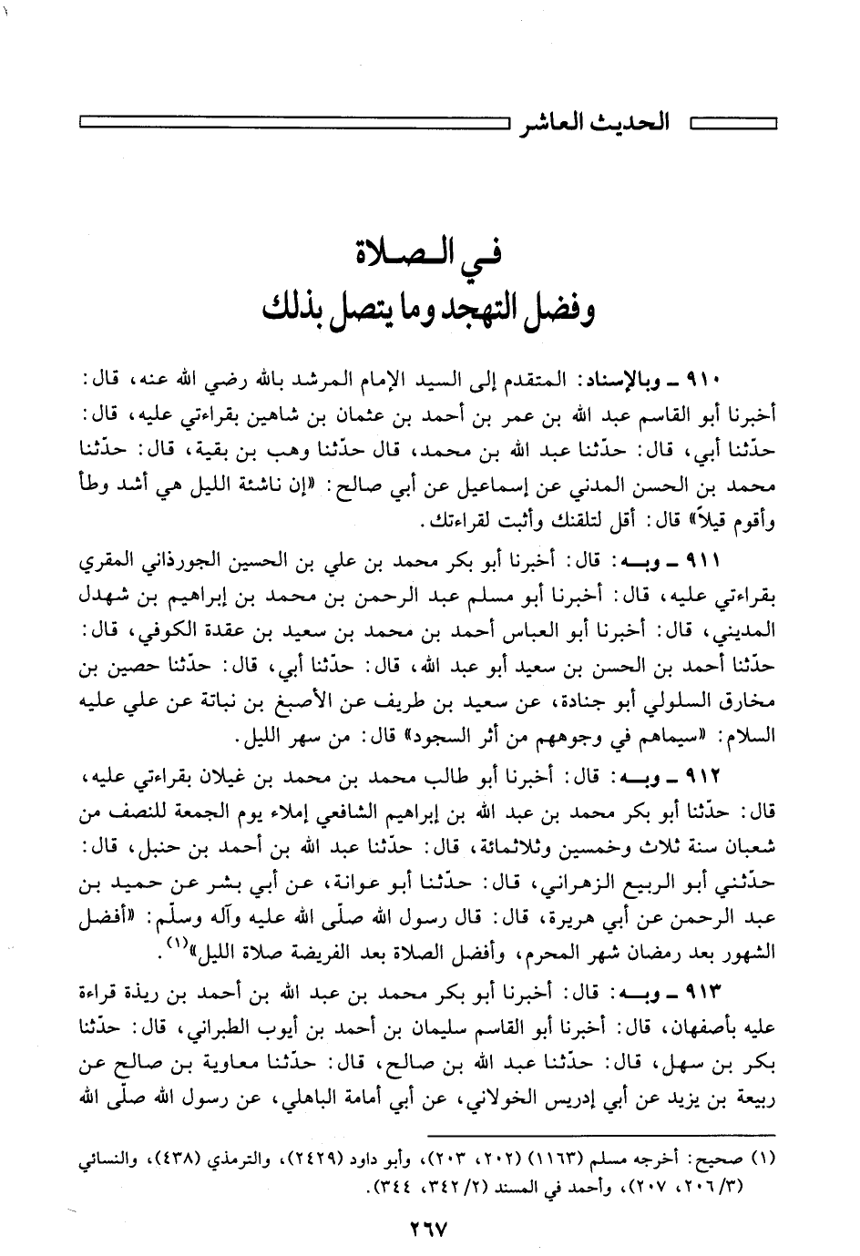 912 - أَخْبَرَنَا أَبُو طَالِبٍ مُحَمَّدُ بْنُ مُحَمَّدِ بْنِ غَيْلَانَ، بِقِرَاءَتِي عَلَيْهِ، قَالَ: حَدَّثَنَا أَبُو بَكْرٍ مُحَمَّدُ بْنُ عَبْدِ اللَّهِ بْنِ إِبْرَاهِيمَ الشَّافِعِيُّ، إِمْلَاءً يَوْمَ الْجُمُعَةِ لِلنِّصْفِ مِنْ شَعْبَانَ سَنَةَ ثَلَاثٍ وَخَمْسِينَ وَثَلاثِ مِائَةٍ، قَالَ: حَدَّثَنَا عَبْدُ اللَّهِ بْنُ أَحْمَدَ بْنِ حَنْبَلٍ، قَالَ: حَدَّثَنِي أَبُو الرَّبِيعِ الزَّهْرَانِيُّ، قَالَ: حَدَّثَنَا أَبُو عَوَانَةَ، عَنْ أَبِي بِشْرٍ، عَنْ حُمَيْدِ بْنِ عَبْدِ الرَّحْمَنِ، عَنْ أَبِي هُرَيْرَةَ، قَالَ: قَالَ رَسُولُ اللَّهِ صَلَّى اللَّهُ عَلَيْهِ وَآلِهِ وَسَلَّمَ: «أَفْضَلُ الشُّهُورِ بَعْدَ رَمَضَانَ شَهْرُ الْمُحَرَّمِ، وَأَفْضَلُ الصَّلَاةِ بَعْدَ الْفَرِيضَةِ صَلَاةُ اللَّيْلِ»