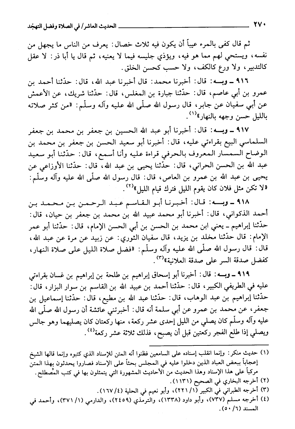 917 - أَخْبَرَنَا أَبُو عَبْدِ اللَّهِ الْحُسَيْنُ بْنُ جَعْفَرِ بْنِ مُحَمَّدِ بْنِ جَعْفَرٍ السَّلَمَاسِيُّ الْبَيِّعُ، بِقِرَاءَتِي عَلَيْهِ، قَالَ: أَخْبَرَنَا أَبُو سَعِيدٍ الْحَسَنُ بْنُ جَعْفَرِ بْنِ مُحَمَّدِ بْنِ الْوَضَّاحِ السِّمْسَارُ الْمَعْرُوفُ بِالْحِرَفِيِّ، قِرَاءَةً عَلَيْهِ وَأَنَا أَسْمَعُ، قَالَ: حَدَّثَنَا أَبُو سَعِيدٍ عَبْدُ اللَّهِ بْنُ الْحَسَنِ الْحَرَّانِيُّ، قَالَ: حَدَّثَنَا يَحْيَى بْن عَبْدِ اللَّهِ، قَالَ: حَدَّثَنَا الْأَوْزَاعِيُّ، عَنْ يَحْيَى بْنِ عَبْدِ اللَّهِ بْنِ عَمْرِو بْنِ الْعَاصِ، قَالَ: قَالَ رَسُولُ اللَّهِ صَلَّى اللَّهُ عَلَيْهِ وَآلِهِ وَسَلَّمَ: «لَا تَكُنْ مِثْلَ فُلَانٍ كَانَ يَقُومُ اللَّيْلَ فَتَرَكَ قِيَامَ اللَّيْلِ»