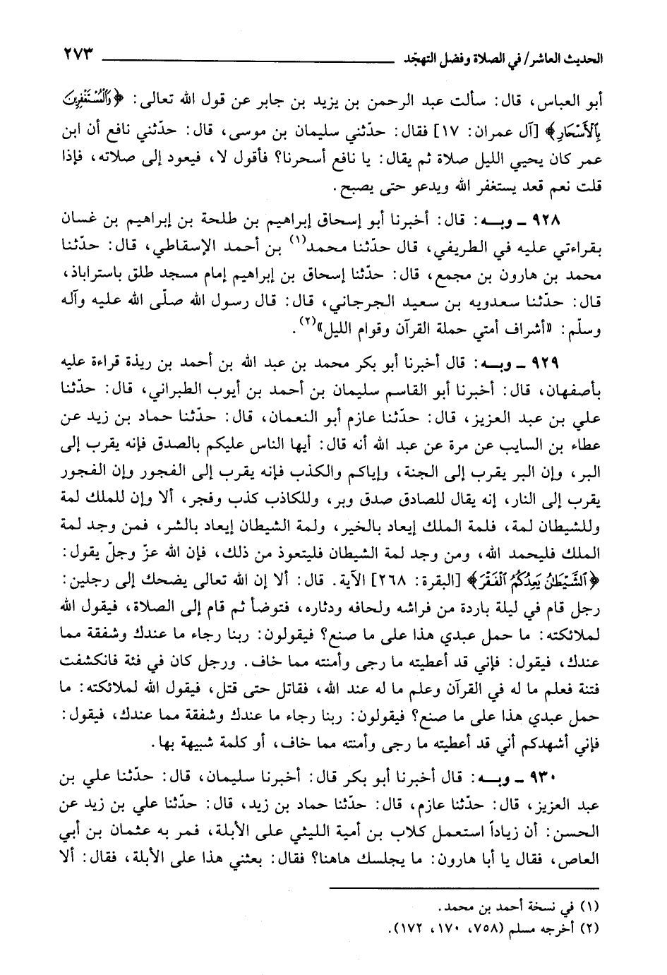 928 - أَخْبَرَنَا إِبْرَاهِيمُ بْنُ طَلْحَةَ بْنِ إِبْرَاهِيمَ بْنِ غَسَّانَ، بِقِرَاءَتِي عَلَيْهِ فِي الطَّرِيفِيِّ، قَالَ: حَدَّثَنَا مُحَمَّدُ بْنُ أَحْمَدَ الْإِسْقَاطِيُّ، قَالَ: حَدَّثَنَا مُحَمَّدُ بْنُ هَارُونَ بْنِ مُجَمِّعٍ، قَالَ: حَدَّثَنَا بْنُ إِبْرَاهِيمَ، إِمَامُ مَسْجِدِ طَلْقٍ بِاسْتَرَابَاذَ، قَالَ: حَدَّثَنَا سَعْدُوَيْهِ بْنُ سَعِيدٍ الْجُرْجَانِيُّ، قَالَ: قَالَ رَسُولُ اللَّهِ صَلَّى اللَّهُ عَلَيْهِ وَآلِهِ وَسَلَّمَ: «أَشَارِفُ أُمَّتِي حَمَلَةُ الْقُرْآنِ وَقُوَّامُ اللَّيْلِ»