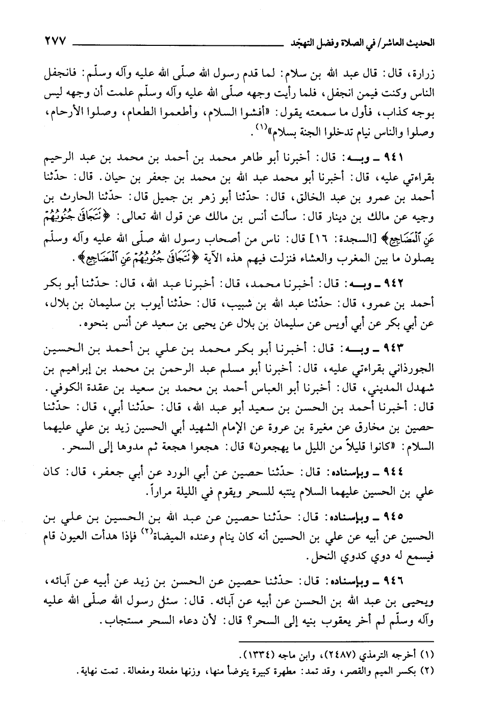943 - أَخْبَرَنَا أَبُو بَكْرٍ مُحَمَّدُ بْنُ عَلِيِّ بْنِ مُحَمَّدِ بْنِ الْحُسَيْنِ الْجُوزَدَانِيُّ، بِقِرَاءَتِي عَلَيْهِ، قَالَ: أَبُو مُسْلِمٍ عَبْدُ الرَّحْمَنِ بْنُ مُحَمَّدِ بْنِ إِبْرَاهِيمَ بْنِ شَهْدَلٍ الْمَدِينِيُّ، قَالَ: أَخْبَرَنَا أَبُو الْعَبَّاسِ أَحْمَدُ بْنُ مُحَمَّدِ بْنِ سَعِيدِ بْنِ عُقْدَةَ الْكُوفِيُّ، قَالَ: أَخْبَرَنَا أَحْمَدُ بْنُ الْحَسَنِ بْنِ سَعِيدٍ أَبُو عَبْدِ اللَّهِ، قَالَ: حَدَّثَنَا أَبِي، قَالَ: حَدَّثَنَا حُصَيْنُ بْنُ مُخَارِقٍ، عَنْ مُغِيرَةَ بْنِ عُرْوَةَ، عَنِ الْإِمَامِ الشَّهِيدِ أَبِي الْحُسَيْنِ زَيْدِ بْنِ عَلِيٍّ، عَلَيْهِمَا السَّلَامُ " {كَانُوا قَلِيلا مِنَ اللَّيْلِ مَا يَهْجَعُونَ} [الذاريات: 17] ، قَالَ: هَجَعُوا هَجْعَةً ثُمَّ مَدُّوهَا إِلَى السَّحَرِ ".