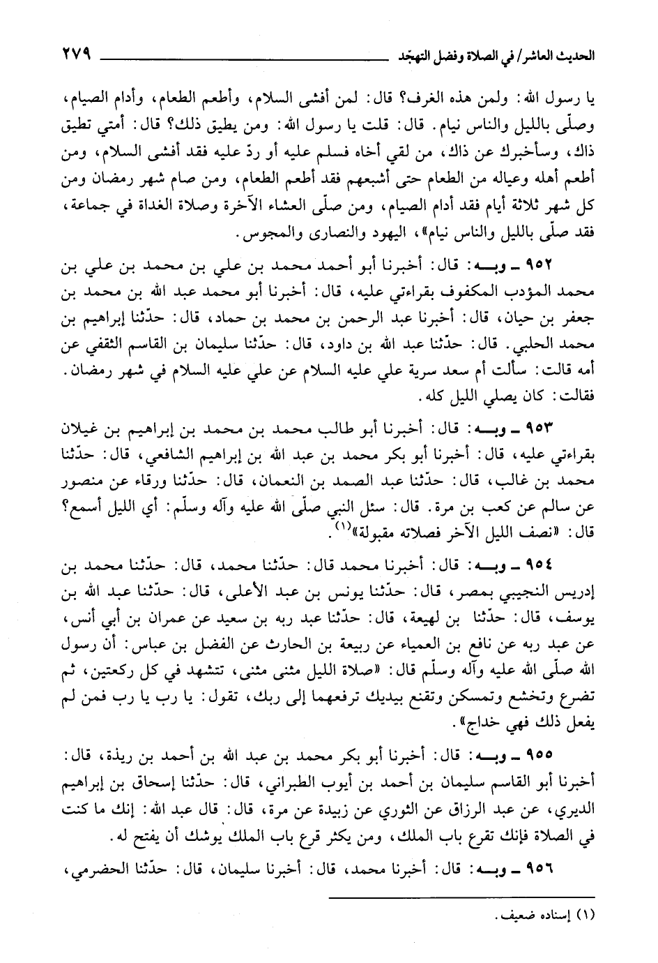 952 - أَخْبَرَنَا أَبُو أَحْمَدَ مُحَمَّدُ بْنُ عَلِيِّ بْنِ مُحَمَّدٍ الْمُؤَدِّبُ الْمَعْرُوفُ بِالْمَكْفُوفِ، بِقِرَاءَتِي عَلَيْهِ، قَالَ: أَبُو مُحَمَّدٍ عَبْدُ اللَّهِ بْنُ جَعْفَرِ بْنِ حَيَّانَ، قَالَ: أَخْبَرَنَا عَبْدُ الرَّحْمَنِ بْنُ مُحَمَّدِ بْنِ حَمَّادٍ، قَالَ: حَدَّثَنَا إِبْرَاهِيمُ بْنُ مُحَمَّدٍ الْحَلَبِيُّ، قَالَ: حَدَّثَنَا عَبْدُ اللَّهِ بْنُ دَاوُدَ، قَالَ: حَدَّثَنَا سُلَيْمَانُ بْنُ الْقَاسِمِ الثَّقَفِيُّ، عَنْ أُمِّهِ، قَالَتْ: " سَأَلْتُ أُمِّ سَعْدٍ سَرِيَّةَ عَلِيٍّ عَلَيْهِ السَّلَامُ عَنْ عَلِيٍّ عَلَيْهِ السَّلَامُ فِي شَهْرِ رَمَضَانَ، فَقَالَتْ: كَانَ يُصَلِّي اللَّيْلَ كُلَّهُ "