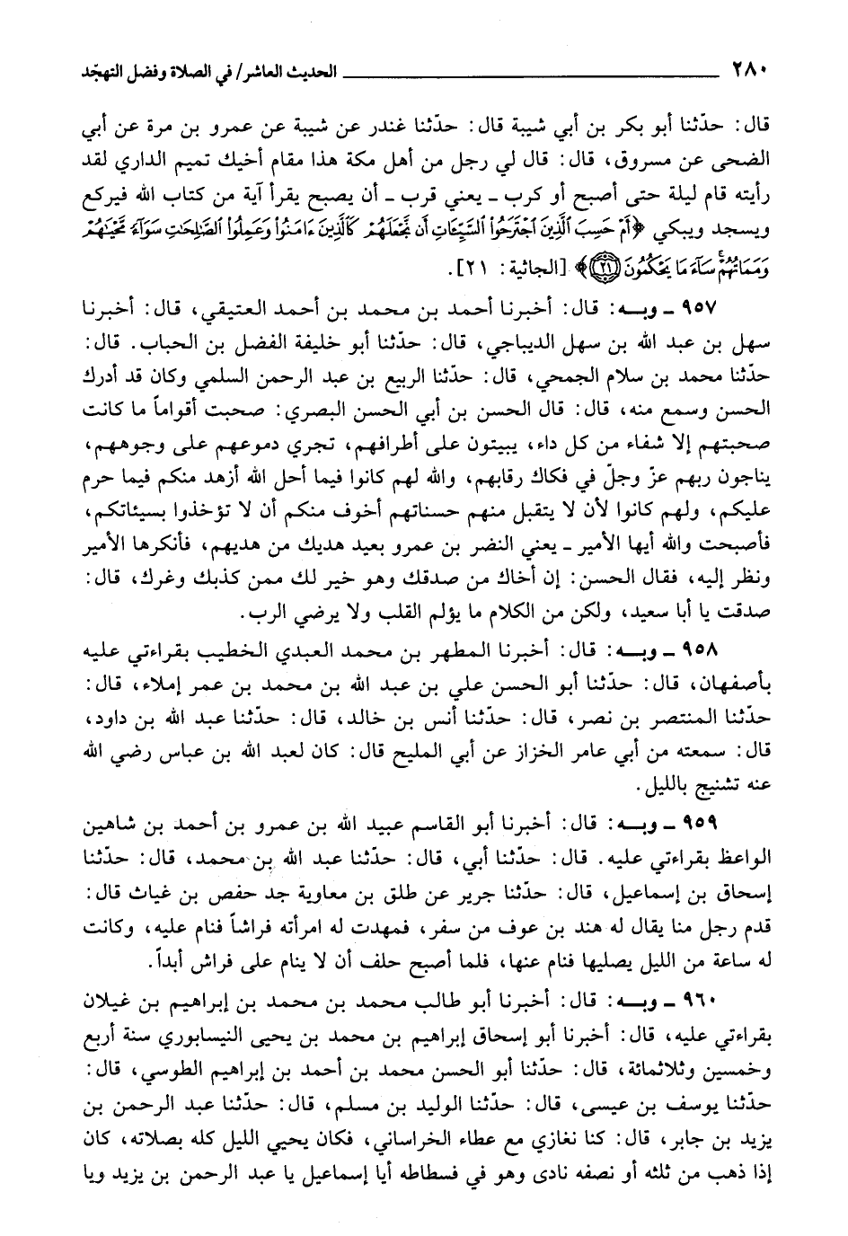 958 - أَخْبَرَنَا الْمُطَهَّرُ بْنُ مُحَمَّدٍ الْعَبْدِيُّ الْخَطِيبُ، بِقِرَاءَتِي عَلَيْهِ بِأَصْفَهَانَ، قَالَ: حَدَّثَنَا أَبُو الْحَسَنِ عَلِيُّ بْنُ عَبْدِ اللَّهِ بْنِ مُحَمَّدِ بْنِ عُمَرَ إِمْلَاءً، قَالَ: حَدَّثَنَا الْمُنْتَصِرُ بْنُ نَصْرٍ، قَالَ: حَدَّثَنَا أَنَسُ بْنُ خَالِدٍ، قَالَ: حَدَّثَنَا عَبْدُ اللَّهِ بْنُ دَاوُدَ، قَالَ: سَمِعْتُهُ مِنْ أَبِي عَامِرٍ الْخَزَّازِ، عَنْ أَبِي الْمَلِيحِ، قَالَ: «كَانَ لِعَبْدِ اللَّهِ بْنِ عَبَّاسٍ رَضِيَ اللَّهُ عَنْهُ تَشْنِيجٌ بِاللَّيْلِ»