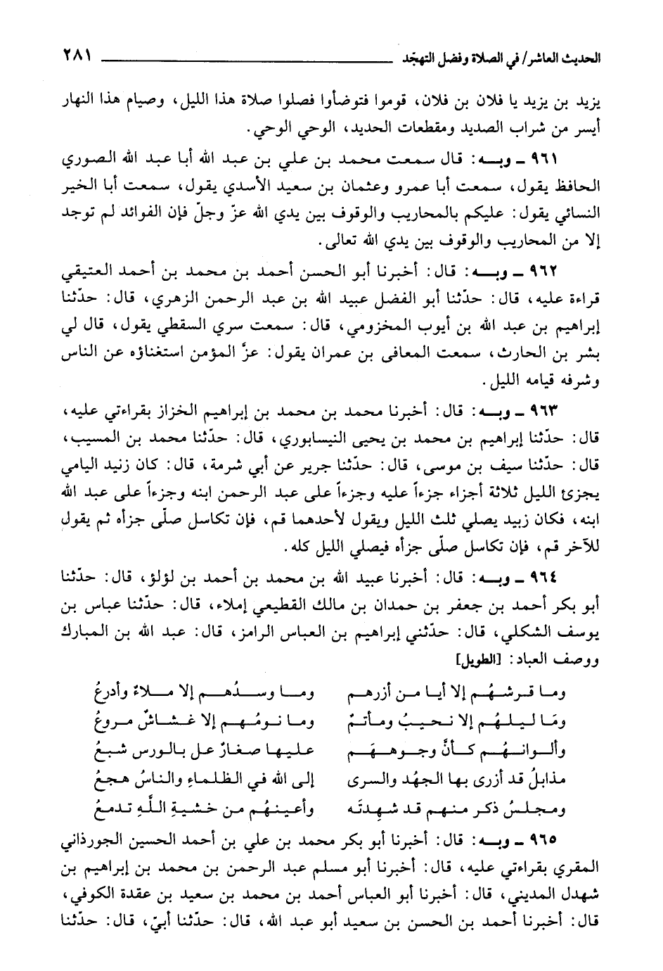 964 - أَخْبَرَنَا عُبَيْدُ اللَّهِ بْنُ مُحَمَّدِ بْنِ أَحْمَدَ بْنِ لُؤْلُؤٍ، قَالَ: حَدَّثَنَا أَبُو بَكْرٍ أَحْمَدُ بْنُ جَعْفَرِ بْنِ حَمْدَانَ بْنِ مَالِكٍ الْقَطِيعِيُّ، إِمْلَاءً، قَالَ: حَدَّثَنَا عَبَّاسُ بْنُ يُوسُفَ الشِّكْلِيُّ، قَالَ: حَدَّثَنِي إِبْرَاهِيمُ بْنُ الْعَبَّاسِ الرَّامِزُ، قَالَ: عَبْدُ اللَّهِ بْنُ الْمُبَارَكِ وَوَصَفَ الْعُبَّادَ: «