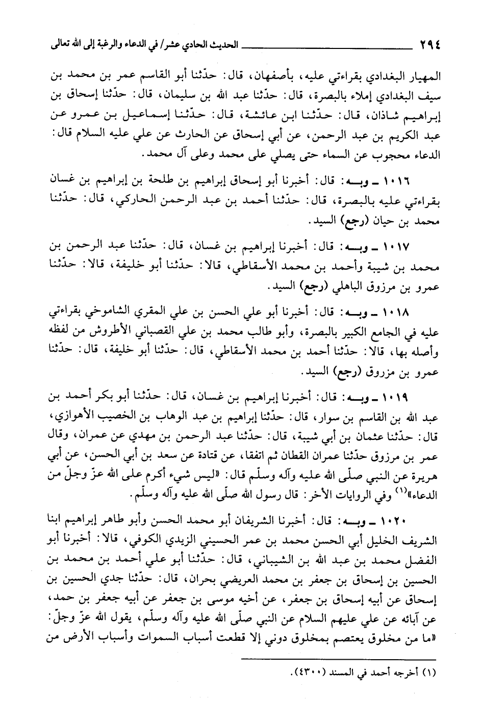 1020 - أَخْبَرَنَا الشَّرِيفَانِ أَبُو مُحَمَّدٍ الْحَسَنُ، وَأَبُو طَاهِرٍ إِبْرَاهِيمُ، ابْنَا الشَّرِيفِ الْخَلِيلِ أَبِي الْحَسَنِ مُحَمَّدِ بْنِ عُمَرَ الْحُسَيْنِيِّ الزَّيْدِيِّ الْكُوفِيِّ، قَالَا: أَخْبَرَنَا أَبُو الْفَضْلِ مُحَمَّدُ بْنُ عَبْدِ اللَّهِ بْنِ الشَّيْبَانِيُّ، قَالَ: حَدَّثَنَا أَبُو عَلِيٍّ أَحْمَدُ بْنُ مُحَمَّدِ بْنِ الْحُسَيْنِ بْنِ إِسْحَاقَ بْنِ جَعْفَرِ بْنِ مُحَمَّدٍ الْعَرِيضِيُّ بَحْرَانُ، قَالَ: حَدَّثَنَا جَدِّي الْحُسَيْنُ بْنُ إِسْحَاقَ، عَنْ أَبِيهِ إِسْحَاقَ بْنِ جَعْفَرٍ، عَنْ أَخِيهِ مُوسَى بْنِ جَعْفَرٍ، عَنْ أَبِيهِ جَعْفَرِ بْنِ حَمَدَ، عَنْ آبَائِهِ، عَنْ عَلِيٍّ عَلَيْهِمُ السَّلَامُ، عَنِ النَّبِيِّ صَلَّى اللَّهُ عَلَيْهِ وَآلِهِ وَسَلَّمَ، يَقُولُ اللَّهُ عَزَّ وَجَلَّ: «مَا مِنْ مَخْلُوقٍ يَعْتَصِمُ بِمَخْلُوقٍ دُونِي إِلَّا قَطَعْتُ أَسْبَابَ السَّمَوَاتِ وَأَسْبَابَ الْأَرْضِ مِنْ