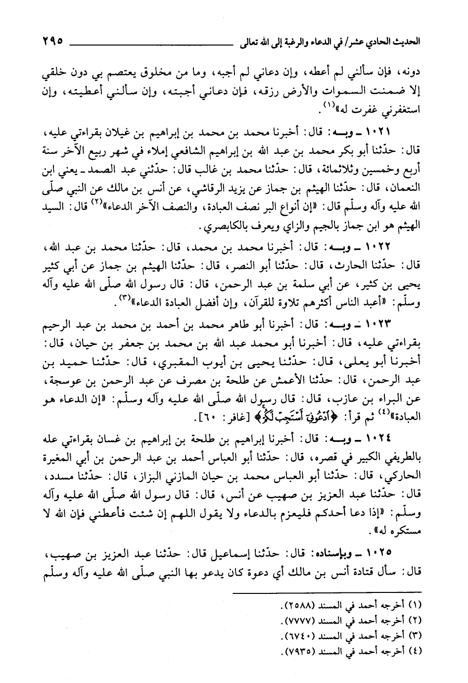 1021 - أَخْبَرَنَا مُحَمَّدُ بْنُ مُحَمَّدِ بْنِ إِبْرَاهِيمَ بْنِ غَيْلَانَ، بِقِرَاءَتِي عَلَيْهِ، قَالَ: حَدَّثَنَا أَبُو بَكْرٍ مُحَمَّدُ بْنُ عَبْدِ اللَّهِ بْنِ إِبْرَاهِيمَ الشَّافِعِيُّ، إِمْلَاءً فِي شَهْرِ رَبِيعٍ الْآخِرِ سَنَةَ أَرْبَعٍ وَخَمْسِينَ وَثَلاثِ مِائَةٍ، قَالَ: حَدَّثَنَا مُحَمَّدُ بْنُ غَالِبٍ، قَالَ: حَدَّثَنَا عَبْدُ الصَّمَدِ يَعْنِي ابْنَ النُّعْمَانِ، قَالَ: حَدَّثَنَا الْهَيْثَمُ بْنُ جَمَّازٍ، عَنْ يَزِيدَ الرَّقَاشِيِّ، عَنْ أَنَسِ بْنِ مَالِكٍ، عَنِ النَّبِيِّ صَلَّى اللَّهُ عَلَيْهِ وَآلِهِ وَسَلَّمَ، قَالَ: «إِنَّ أَنْوَاعَ الْبِرِّ نِصْفُ الْعِبَادَةِ، وَالنِّصْفُ الْآخَرُ الدُّعَاءُ» .