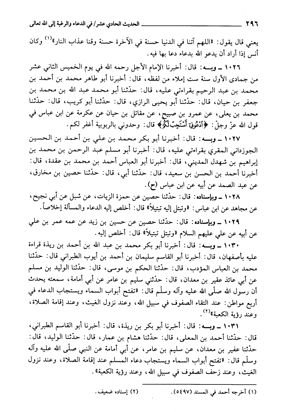 1031 - أَخْبَرَنَا أَبُو بَكْرِ بْنُ رَيْذَةَ، قَالَ: أَخْبَرَنَا أَبُو الْقَاسِمِ الطَّبَرَانِيُّ، قَالَ: حَدَّثَنَا أَحْمَدُ بْنُ الْمُعَلَّى، قَالَ: حَدَّثَنَا هِشَامُ بْنُ عَمَّارٍ، قَالَ: حَدَّثَنَا الْوَلِيدُ، قَالَ: حَدَّثَنَا عُفَيْرُ بْنُ مَعْدَانَ، عَنْ سُلَيْمِ بْنِ عَامِرٍ، عَنْ أَبِي أُمَامَةَ، عَنِ النَّبِيِّ صَلَّى اللَّهُ عَلَيْهِ وَآلِهِ وَسَلَّمَ، قَالَ: «تُفْتَحُ أَبْوَابُ السَّمَاءِ وَيُسْتَجَابُ دُعَاءُ الْمُسْلِمِ عِنْدَ إِقَامَةِ الصَّلَاةِ، وَعِنْدَ نُزُولِ الْغَيْثِ، وَعِنْدَ زَحْفِ الصُّفُوفِ فِي سَبِيلِ اللَّهِ، وَعِنْدَ رُؤْيَةِ الْكَعْبَةِ»