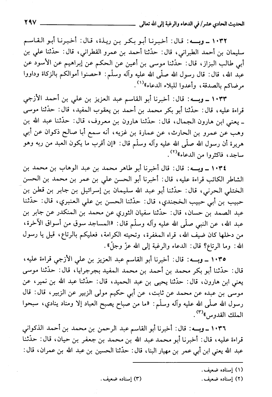 1034 - أَخْبَرَنَا أَبُو طَاهِرٍ مُحَمَّدُ بْنُ عَبْدِ الْوَهَّابِ بْنِ مُحَمَّدِ بْنِ الشَّاطِرِ الْكَاتِبُ، قِرَاءَةً عَلَيْهِ، قَالَ: أَخْبَرَنَا أَبُو الْحَسَنِ عَلِيُّ بْنُ عُمَرَ بْنِ مُحَمَّدِ بْنِ الْحَسَنِ الْخُتُّلِيُّ الْحَرَنِيُّ، قَالَ: حَدَّثَنَا أَبُو عَبْدِ اللَّهِ سُلَيْمَانُ بْنُ إِسْرَائِيلَ بْنِ جَابِرِ بْنِ قَطَنِ بْنِ حَبِيبِ بْنِ أَبِي حَبِيبِ الْخُجَنْدِيُّ، قَالَ: حَدَّثَنَا الْحَسَنُ بْنُ عَلِيٍّ الْعَنْبَرِيُّ، قَالَ: حَدَّثَنَا عَبْدُ الصَّمَدِ بْنُ حَسَّانٍ، قَالَ: حَدَّثَنَا سُفْيَانُ الثَّوْرِيُّ، عَنْ مُحَمَّدِ بْنِ الْمُنْكَدِرِ، عَنْ جَابِرِ بْنِ عَبْدِ اللَّهِ، عَنِ النَّبِيِّ صَلَّى اللَّهُ عَلَيْهِ وَآلِهِ وَسَلَّمَ، قَالَ: «الْمَسَاجِدُ سُوقٌ مِنْ أَسْوَاقِ الْآخِرَةِ، مَنْ دَخَلَهَا كَانَ ضَيْفَ اللَّهِ، قِرَاهُ الْمَغْفِرَةُ، وَتَحِيَّتُهُ الْكَرَامَةُ، فَعَلَيْكُمْ بِالرِّتَاعِ» ، قِيلَ: يَا رَسُولَ اللَّهِ، وَمَا الرِّتَاعُ؟ قَالَ: «الدُّعَاءُ وَالرَّغْبَةُ إِلَى اللَّهِ عَزَّ وَجَلَّ»