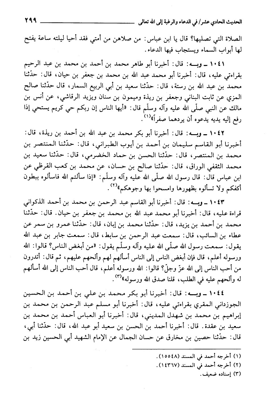 1041 - أَخْبَرَنَا أَبُو طَاهِرِ بْنُ أَحْمَدَ بْنِ مُحَمَّدِ بْنِ عَبْدِ الرَّحِيمِ، بِقِرَاءَتِي عَلَيْهِ، قَالَ: أَبُو مُحَمَّدٍ عَبْدُ اللَّهِ بْنُ مُحَمَّدِ بْنِ جَعْفَرِ بْنِ حَيَّانَ، قَالَ: حَدَّثَنَا مُحَمَّدُ بْنُ عَبْدِ اللَّهِ بْنِ رُسْتَةَ، قَالَ: حَدَّثَنَا سَعِيدُ بْنُ أَبِي الرَّبِيعِ السَّمَّارُ، قَالَ: حَدَّثَنَا صَالِحُ الْمِزِّيُّ، عَنْ ثَابِتٍ الْبُنَانِيِّ، وَجَعْفَرِ بْنِ رِيذَةَ، وَمَيْمُونِ بْنِ سِنَانٍ، وَيَزِيدَ الرَّقَاشِيِّ، عَنْ أَنَسِ بْنِ مَالِكٍ، عَنِ النَّبِيِّ صَلَّى اللَّهُ عَلَيْهِ وَآلِهِ وَسَلَّمَ، قَالَ: «أَيُّهَا النَّاسُ، إِنَّ رَبَّكُمْ حَيٌّ كَرِيمٌ يَسْتَحِي إِذَا رَفَعَ إِلَيْهِ يَدَيْهِ يَدْعُوهُ أَنْ يَرُدَّهُمَا صِفْرًا»
