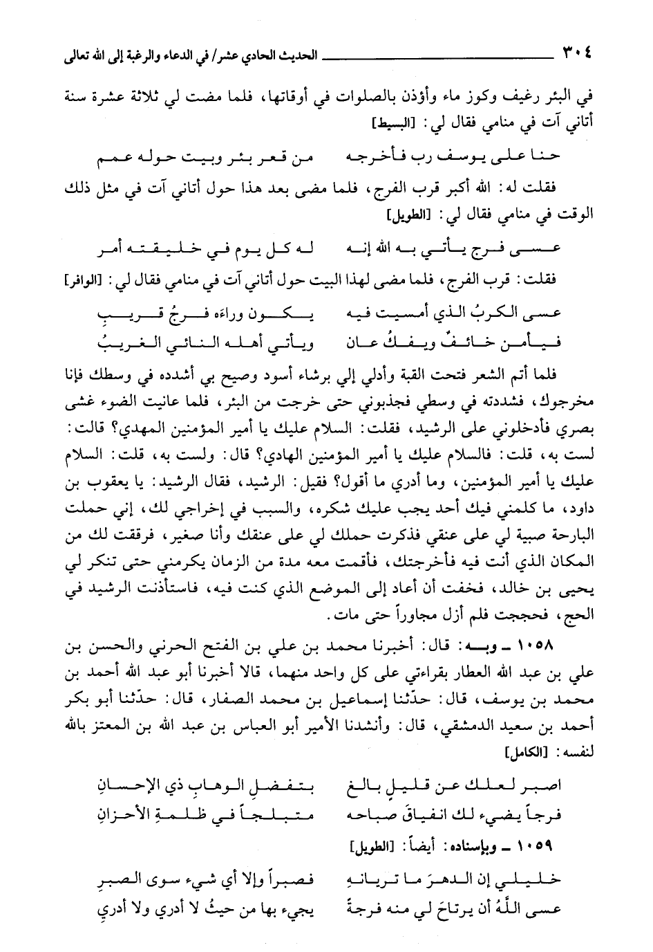 1058 - أَخْبَرَنَا مُحَمَّدُ بْنُ عَلِيِّ بْنِ الْفَتْحِ الْحَرَنِيُّ، وَالْحَسَنُ بْنُ عَلِيِّ بْنِ عَبْدِ اللَّهِ الْعَطَّارُ، بِقِرَاءَتِي عَلَيْهِ عَلَى كُلِّ وَاحِدٍ مِنْهُمَا، قَالَا: أَخْبَرَنَا أَبُو عَبْدِ اللَّهِ أَحْمَدُ بْنُ مُحَمَّدِ بْنِ يُوسُفَ، قَالَ: حَدَّثَنَا إِسْمَاعِيلُ بْنُ مُحَمَّدٍ الصَّفَّارُ، قَالَ: حَدَّثَنَا أَبُو بَكْرٍ أَحْمَدُ بْنُ سَعِيدٍ الدِّمَشْقِيُّ، قَالَ: وَأَنْشَدَنَا الْأَمِيرُ أَبُو الْعَبَّاسِ بْنُ عَبْدِ اللَّهِ بْنِ الْمُعْتَزِّ بِاللَّهِ لِنَفْسِهِ: