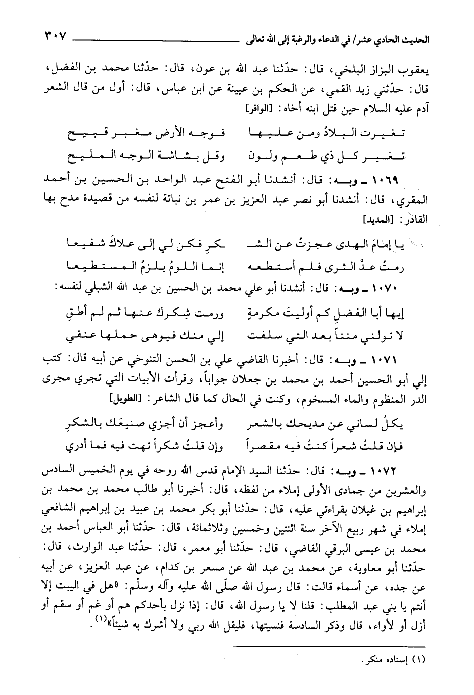 1069 - أَنْشَدَنَا أَبُو الْفَتْحِ عَبْدُ الْوَاحِدِ بْنُ الْحُسَيْنِ بْنِ أَحْمَدُ الْمُقْرِيُّ، قَالَ: أَنْشَدَنَا أَبُو نَصْرٍ عَبْدُ الْعَزِيزِ بْنُ عُمَرَ بْنِ نَبَاتَةَ، لِنَفْسِهِ مِنْ قَصِيدَةٍ مَدَحَ بِهَا الْقَادِرَ:
