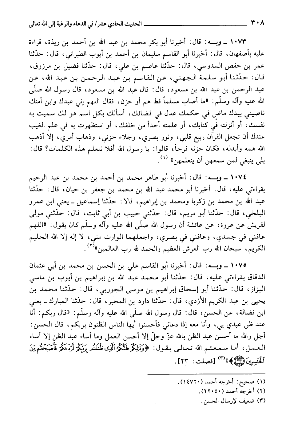 1073 - أَخْبَرَنَا أَبُو بَكْرٍ مُحَمَّدُ بْنُ عَبْدِ اللَّهِ بْنِ أَحْمَدَ بْنِ رَيْذَةَ، قِرَاءَةً عَلَيْهِ بِأَصْهَفَانَ، قَالَ: أَخْبَرَنَا أَبُو الْقَاسِمِ سُلَيْمَانُ بْنُ أَحْمَدَ بْنِ أَيُّوبَ الطَّبَرَانِيُّ، قَالَ: حَدَّثَنَا عُمَرُ بْنُ حَفْصٍ السَّدُوسِيُّ، قَالَ: حَدَّثَنَا عَاصِمُ بْنُ عَلِيٍّ، قَالَ: حَدَّثَنَا فُضَيْلُ بْنُ مَرْزُوقٍ، قَالَ: حَدَّثَنَا أَبُو سَلَمَةَ الْجُهَنِيُّ، عَنِ الْقَاسِمِ بْنِ عَبْدِ الرَّحْمَنِ بْنِ عَبْدِ اللَّهِ، عَنْ عَبْدِ الرَّحْمَنِ بْنِ عَبْدِ اللَّهِ بْنِ مَسْعُودٍ، قَالَ: قَالَ عَبْدُ اللَّهِ بْنُ مَسْعُودٍ، قَالَ رَسُولُ اللَّهِ صَلَّى اللَّهُ عَلَيْهِ وَآلِهِ وَسَلَّمَ: " مَا أَصَابَ مُسْلِمًا قَطُّ هَمٌّ، أَوْ حَزَنٌ، فَقَالَ: اللَّهُمَّ إِنِّي عَبْدُكَ وَابْنُ أَمَتِكَ نَاصِيَتِي بِيَدِكَ مَاضٍ فِيَّ حُكْمُكَ عَدْلٌ فِيَّ قَضَاؤُكَ، أَسْأَلُكَ بِكُلِّ اسْمٍ هُوَ لَكَ سَمَّيْتَ بِهِ نَفْسَكَ، أَوْ أَنْزَلْتَهُ فِي كِتَابِكَ، أَوْعلَّمْتَهُ أَحَدًا مِنْ خَلْقِكَ، أَوِ اسْتَظْهَرْتَ بِهِ فِي عِلْمِ الْغَيْبِ عِنْدَكَ، أَنْ تَجْعَلَ الْقُرْآنَ رَبِيعَ قَلْبِي، وَنُورَ بَصَرِي، وَجِلَاءَ حُزْنِي وَذَهَابَ أَمْرِي، إِلَّا أَذْهَبَ اللَّهُ هَمَّهُ وَأَبْدَلَهُ مَكَانَ حُزْنِهِ فَرَحًا "، قَالُوا: يَا رَسُولَ اللَّهِ، أَفَلَا نَتَعَلَّمُ هَذِهِ الْكَلِمَاتِ، قَالَ: «يَنْبَغِي لِمَنْ سَمِعَهُنَّ أَنْ يَتَعَلَّمَهُنَّ»
