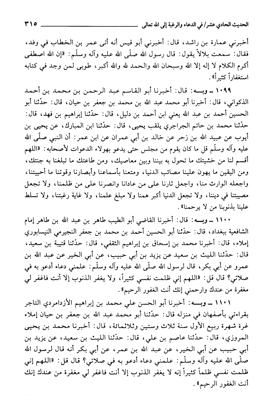 1100 - أَخْبَرَنَا الْقَاضِي أَبُو الطَّيِّبِ طَاهِرُ بْنُ عَبْدِ اللَّهِ بْنِ طَاهِرٍ، إِمَامُ الشَّافِعِيَّةِ بِبَغْدَادَ، قَالَ: حَدَّثَنَا أَبُو الْحُسْيَنِ أَحْمَدُ بْنُ مُحَمَّدِ بْنِ جَعْفَرٍ النَّجِيرَمِيُّ النَّيْسَابُورِيُّ، إِمْلَاءً، قَالَ: أَخْبَرَنَا مُحَمَّدُ بْنُ إِسْحَاقَ بْنِ إِبْرَاهِيمَ الثَّقَفِيُّ، قَالَ: حَدَّثَنَا قُتَيْبَةُ بْنُ سَعِيدٍ، قَالَ: حَدَّثَنَا اللَّيْثُ بْنُ سَعْدٍ، عَنْ يَزِيدَ بْنِ أَبِي حَبِيبٍ، عَنْ أَبِي الْخَيْرِ، عَنْ عَبْدِ اللَّهِ بْنِ عَمْرٍو، عَنْ أَبِي بَكْرٍ، قَالَ لِرَسُولِ اللَّهِ صَلَّى اللَّهُ عَلَيْهِ وَآلِهِ وَسَلَّمَ: عَلِّمْنِي دُعَاءً أَدْعُو بِهِ فِي صَلَاتِي قَالَ: قُلْ: «اللَّهُمَّ إِنِّي ظَلَمْتُ نَفْسِي كَثِيرًا، وَلَا يَغْفِرُ الذُّنُوبَ إِلَّا أَنْتَ فَاغْفِرْ لِي مَغْفِرَةً مِنْ عِنْدِكَ وَارْحَمْنِي إِنَّكَ أَنْتَ الْغَفُورُ الرَّحِيمُ»